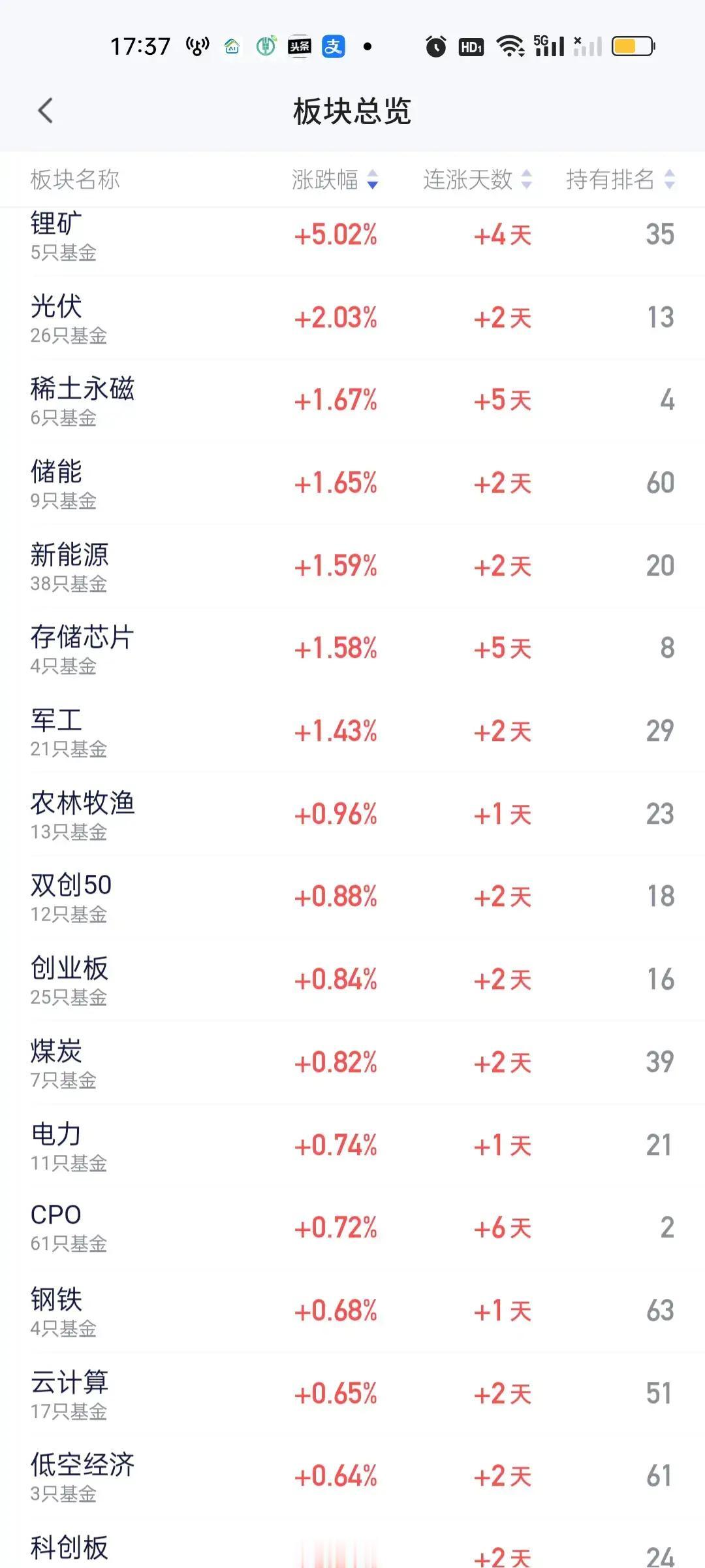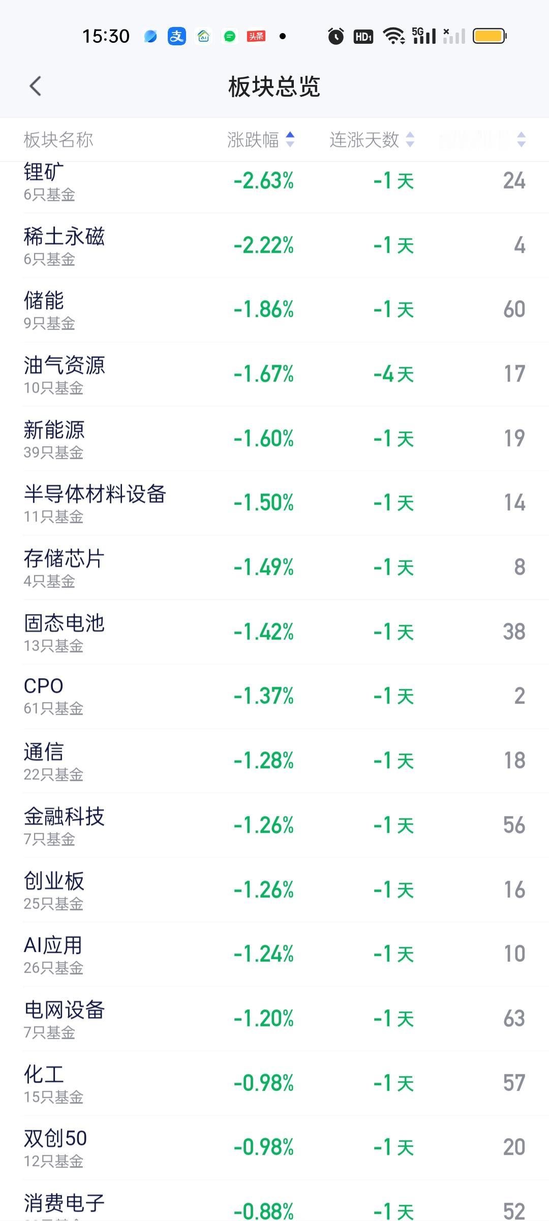 跌幅居前的是锂矿,稀土永磁,储能,油气资源,新能源,半导体材料设备,存储芯片,固态电池,CPO,通信,金融科技,创业板,AI应用,电网设备,化工,双创50,消费电子等。