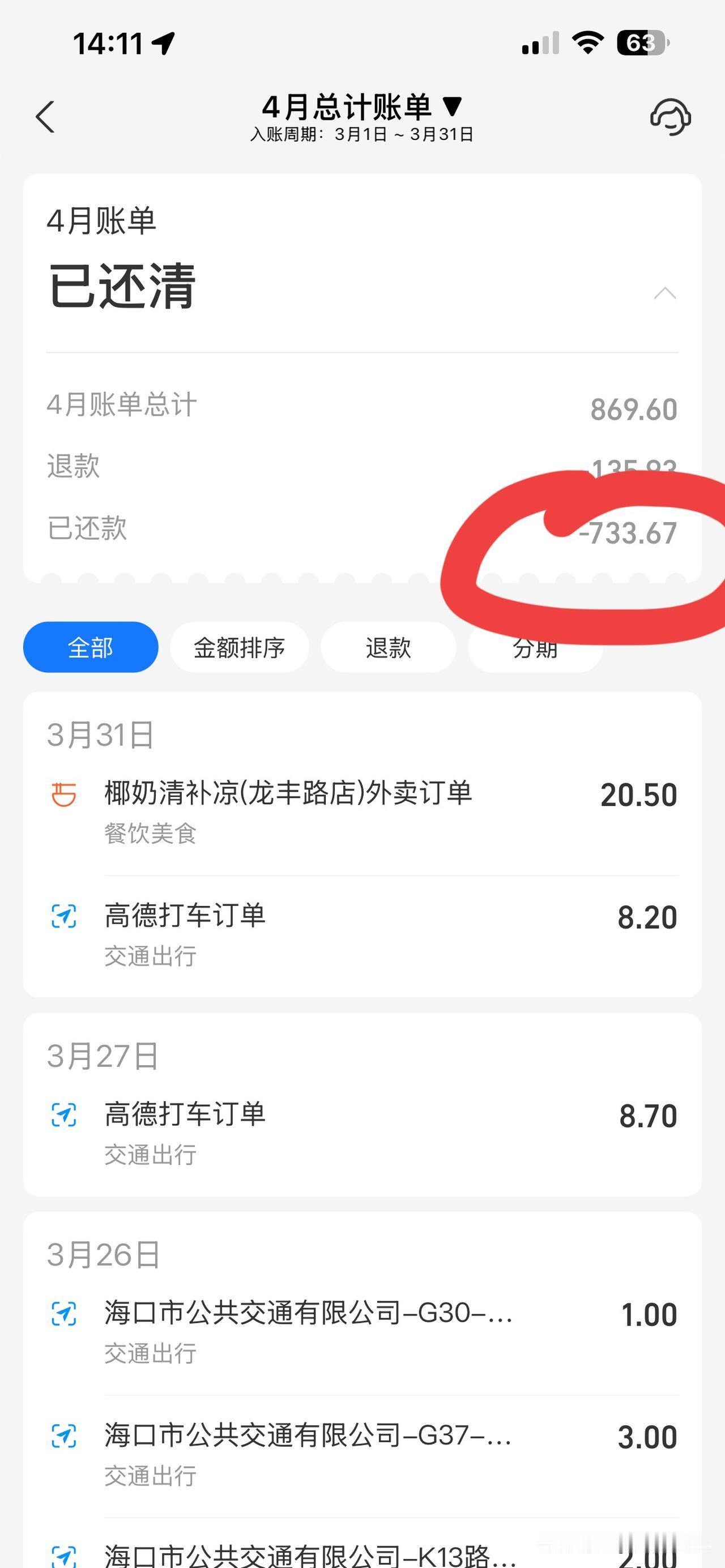 昨天一看微信只有三百多块钱了,赶紧又充了5000块。看了一下账单,杂七杂八的在海口一个月花了7598元(这里包括了来时机票和打车费用500元)