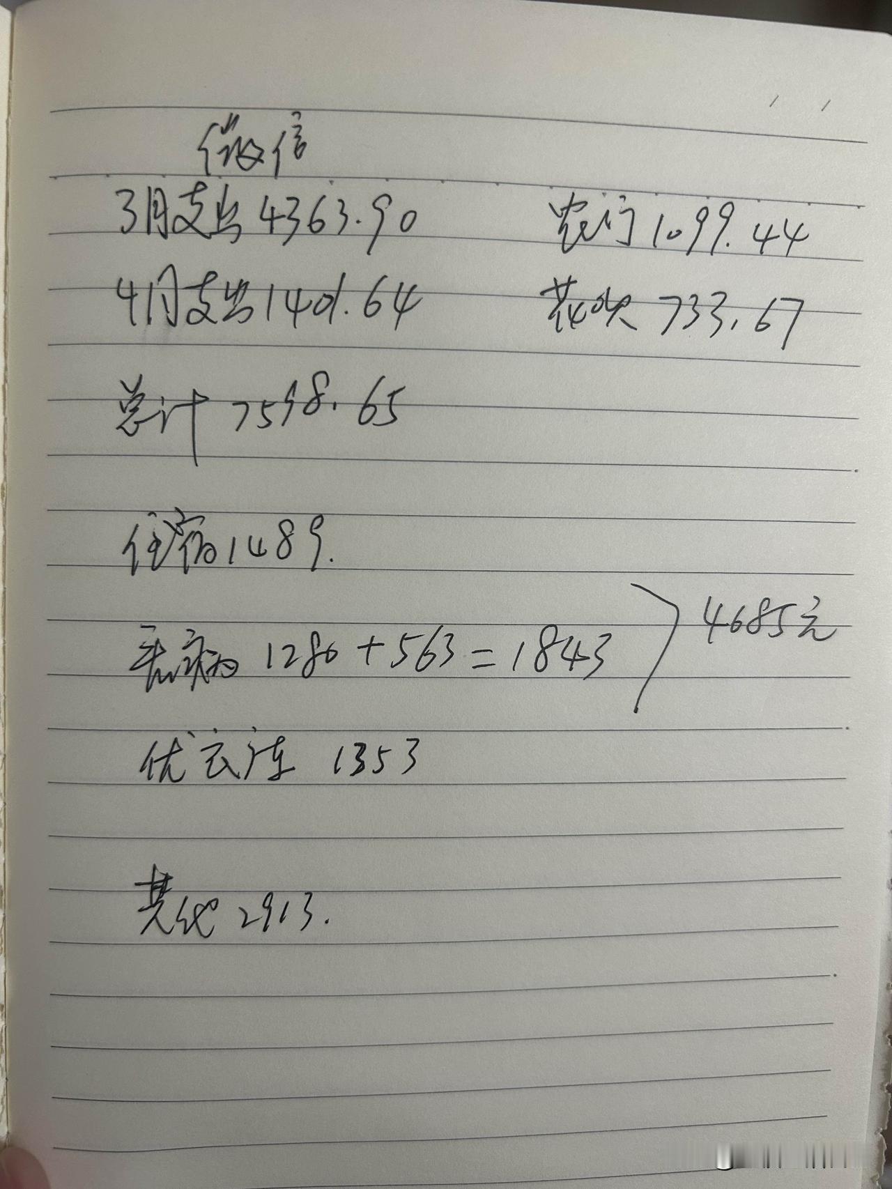 其中住宿1489元(3月8号到21号),看病包括私人诊所和医院的,一共1843元,优衣库买了两次1353元,刨去这些剩下的2913就是吃喝交通了。在海口这些天吃饭最贵一次88,其他就三四十,点外卖十几二十几块,再就是打车、买水这些,其实消费不算高,平均一天不到一百块。