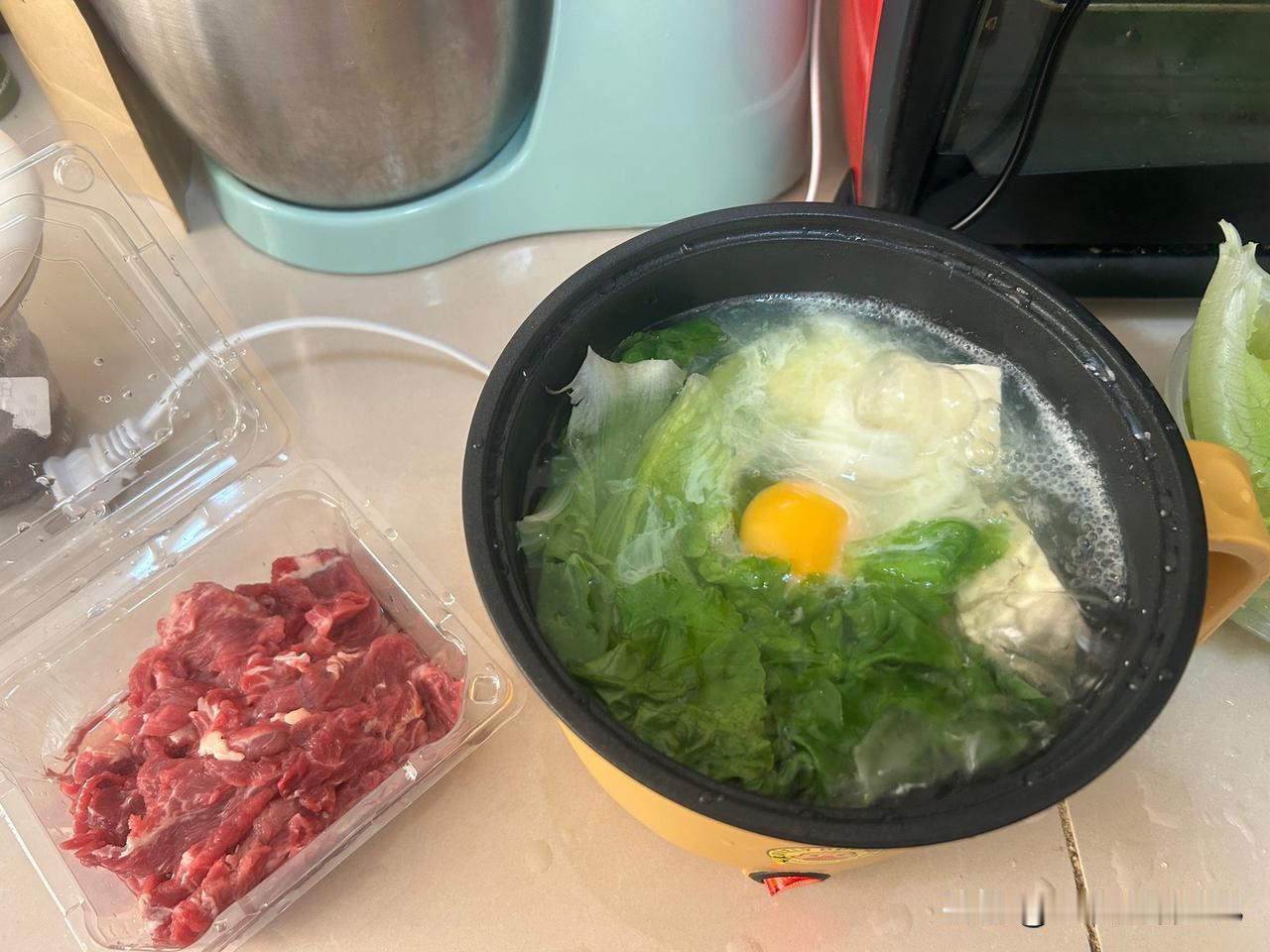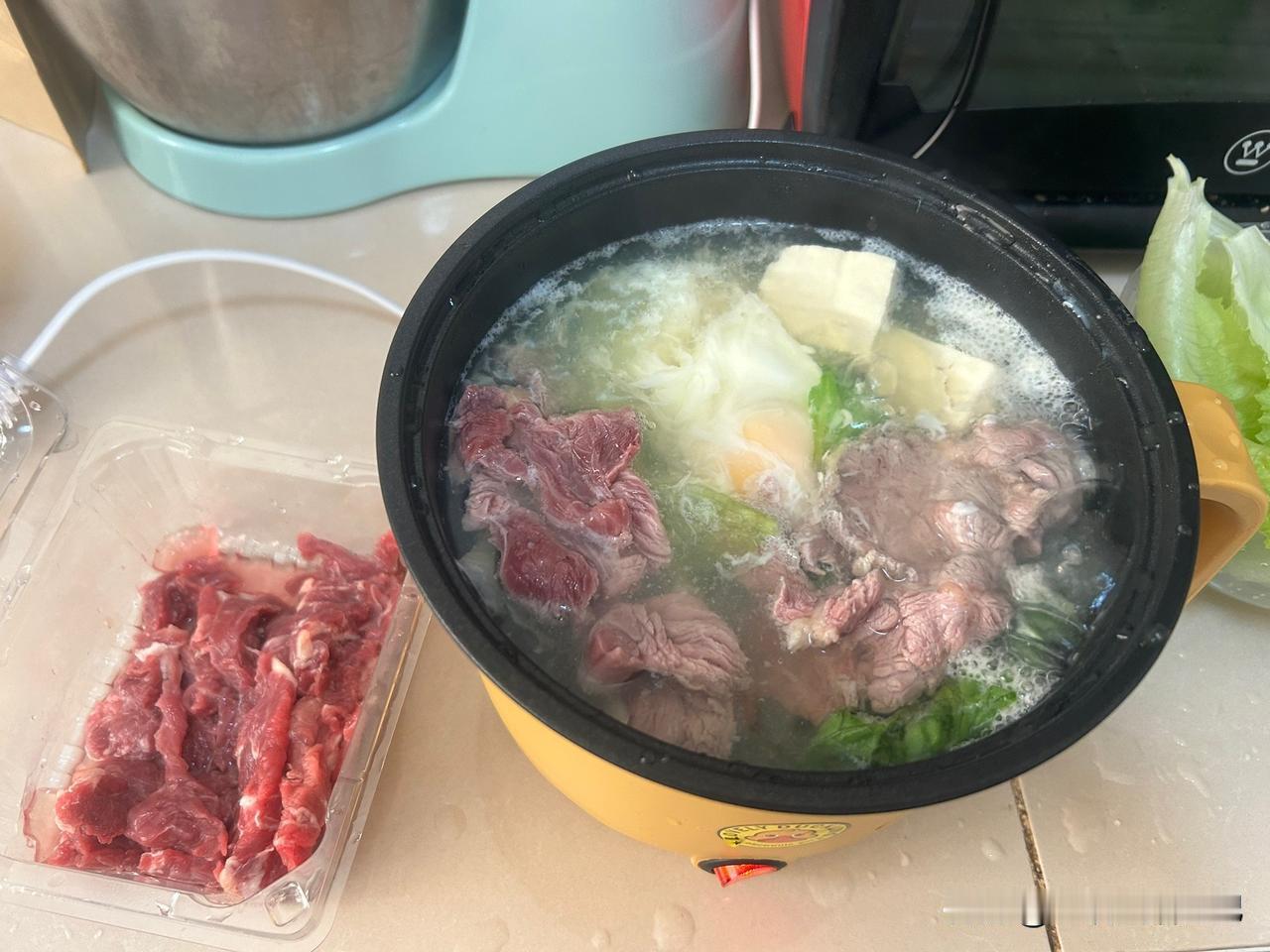 有了这个小电锅简直太方便了,昨天下午在网上买的鲜切牛肉、豆腐和馒头、榨菜,生菜是前一天买的,打个鸡蛋煮上一锅,优质蛋白搭配碳水和蔬菜,营养丰富。蘸料就是酱油和醋,无油少盐,完美!