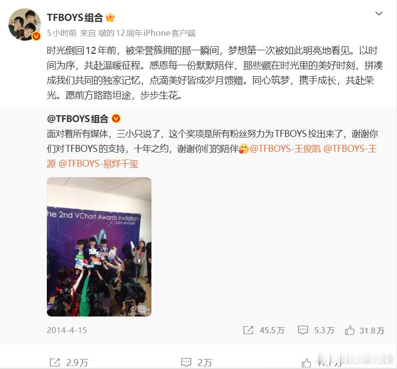TFboys官博庆祝12周年 发文庆祝12周年:“时光倒回12年前,被荣誉簇拥的那一瞬间,梦想第一次被如此明亮地看见。以时间为序,共赴温暖征程。感恩每一份默默陪伴,那些藏在时光里的美好时刻,拼凑成我们共同的独家记忆,点滴美好皆成岁月馈赠。同心筑梦,携手成长,共赴荣光。愿前方路路坦途,步步生花。”