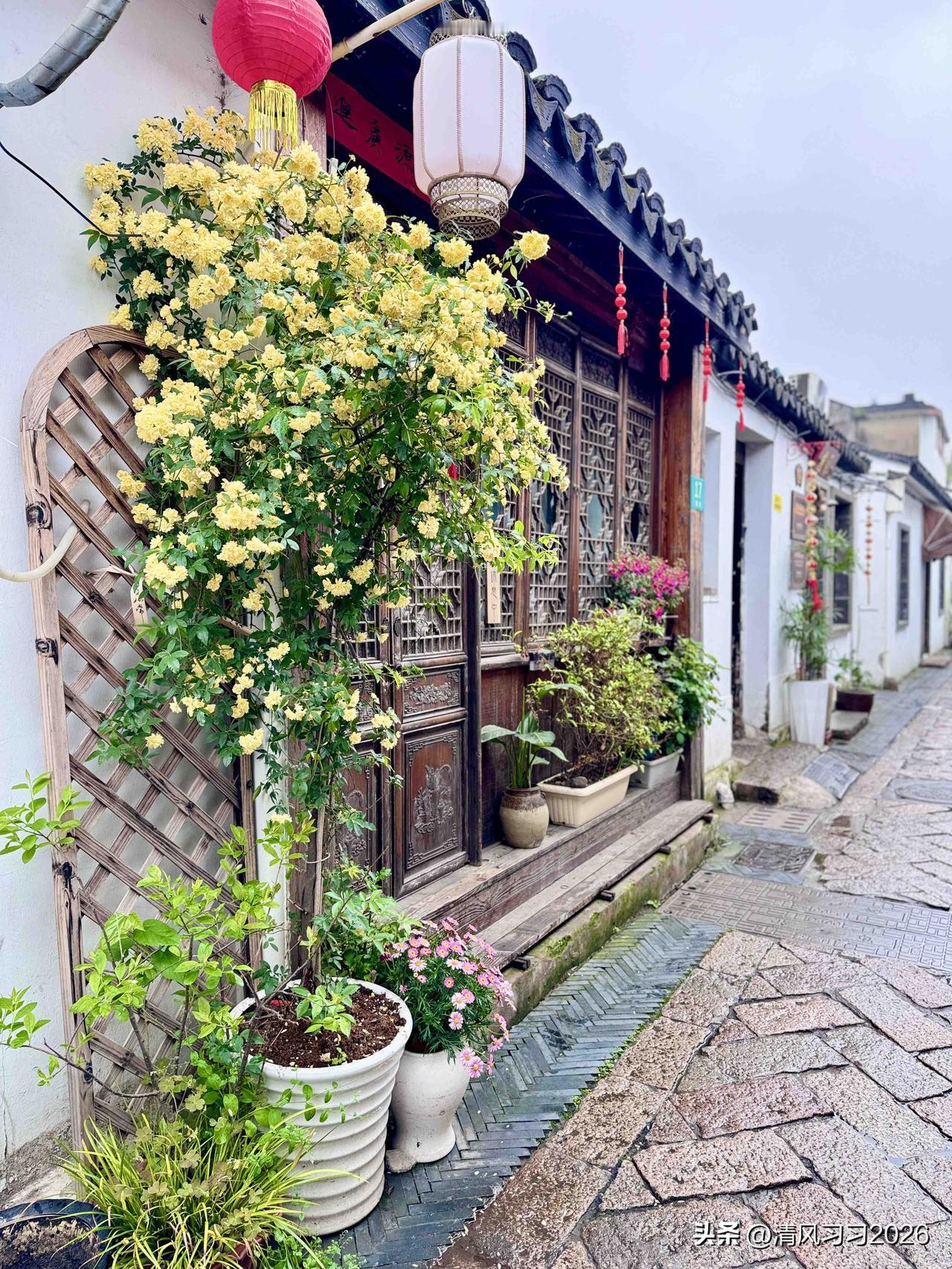从网师园尽兴而归,余韵还绕在指尖。沿着园外的路,向右拐入阔家头巷,才算真正走进了姑苏的日常肌理。这条不长的巷子,像一帧被柔黄光影轻轻润色的画面,白墙静静伫立,花枝从墙头探出来,风一吹就轻轻拂过肩头。