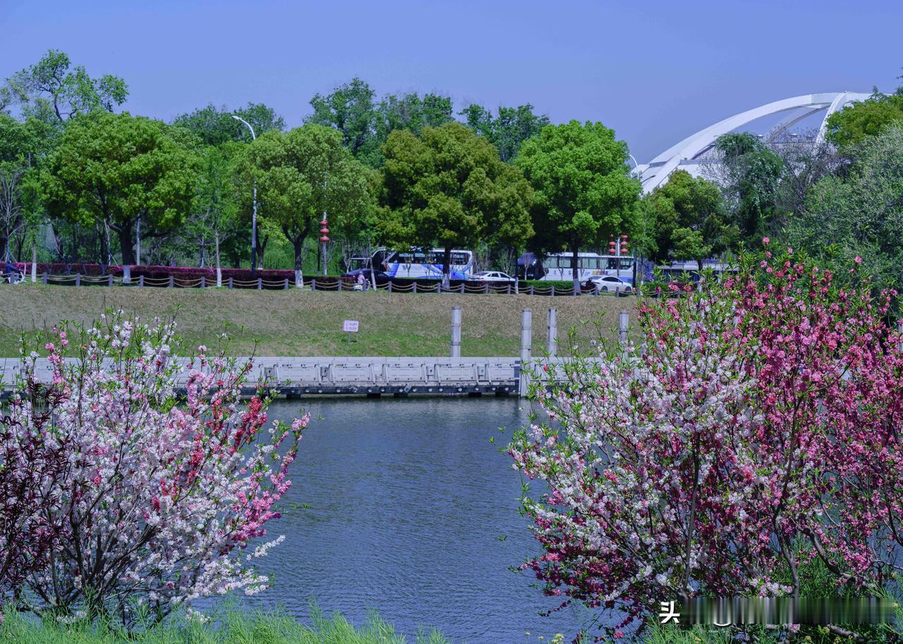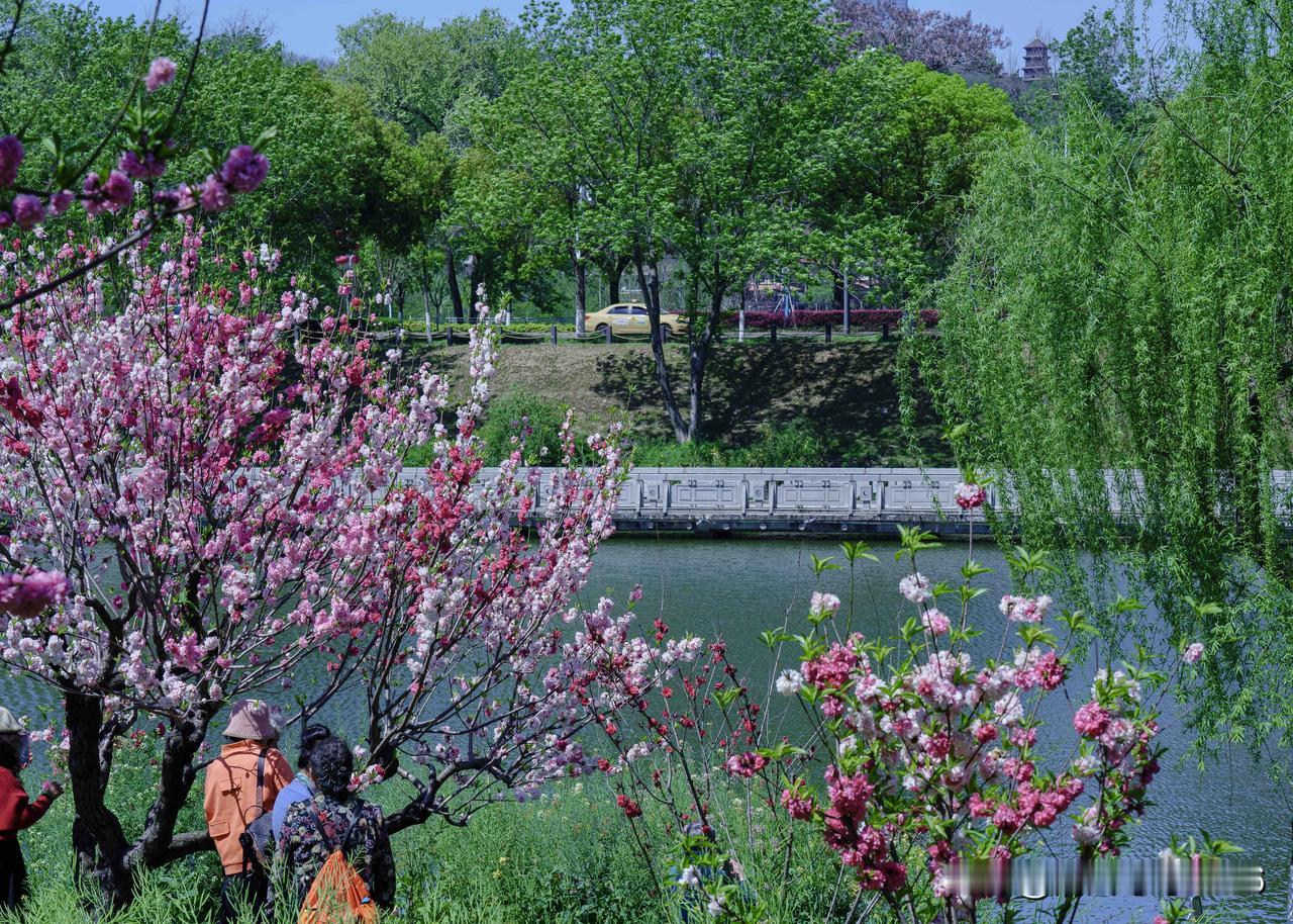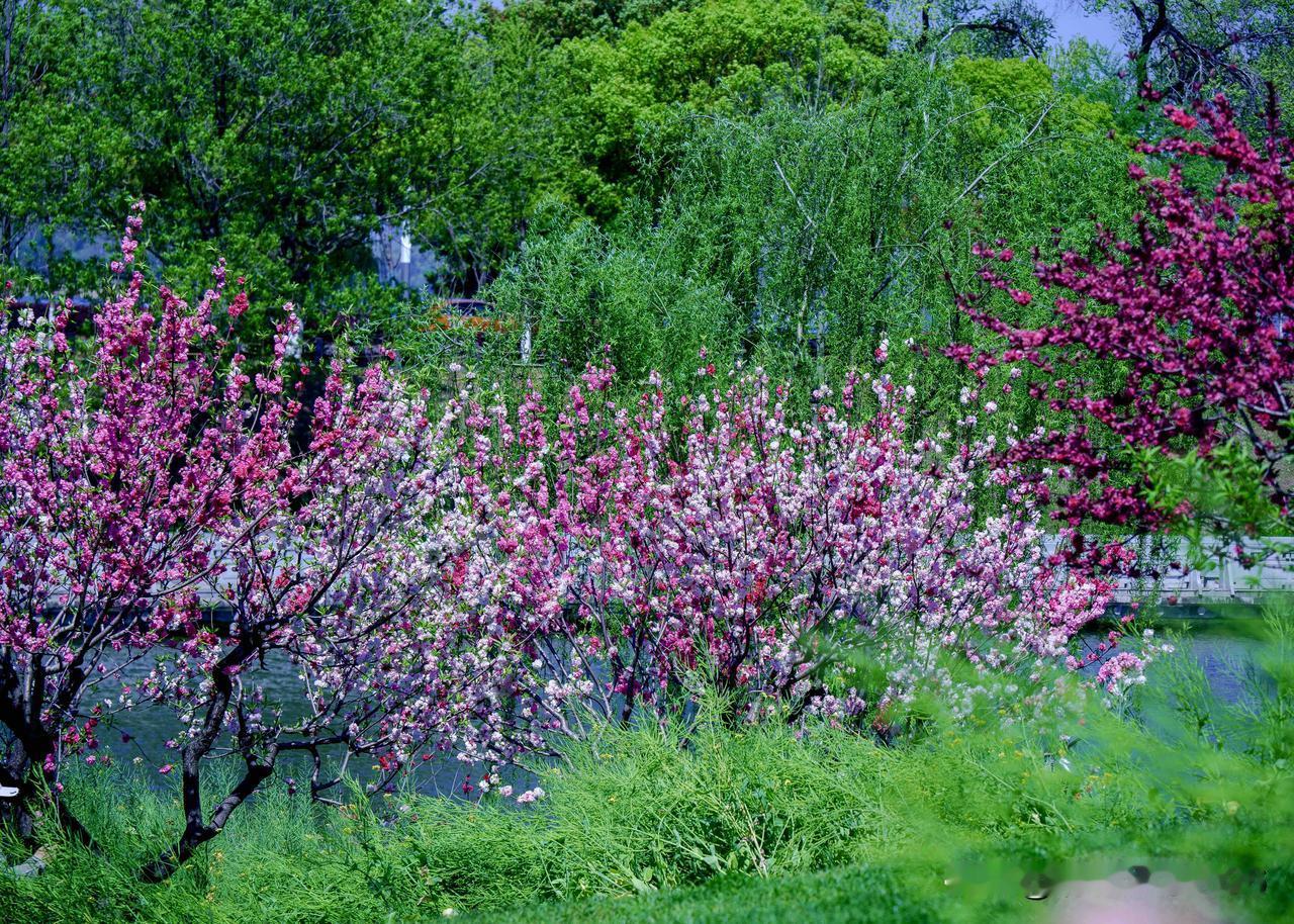不远处一汪碧水旁,粉白相间的碧桃开得正好,花枝临水轻垂,粉白花瓣相映清波,开得明媚动人。