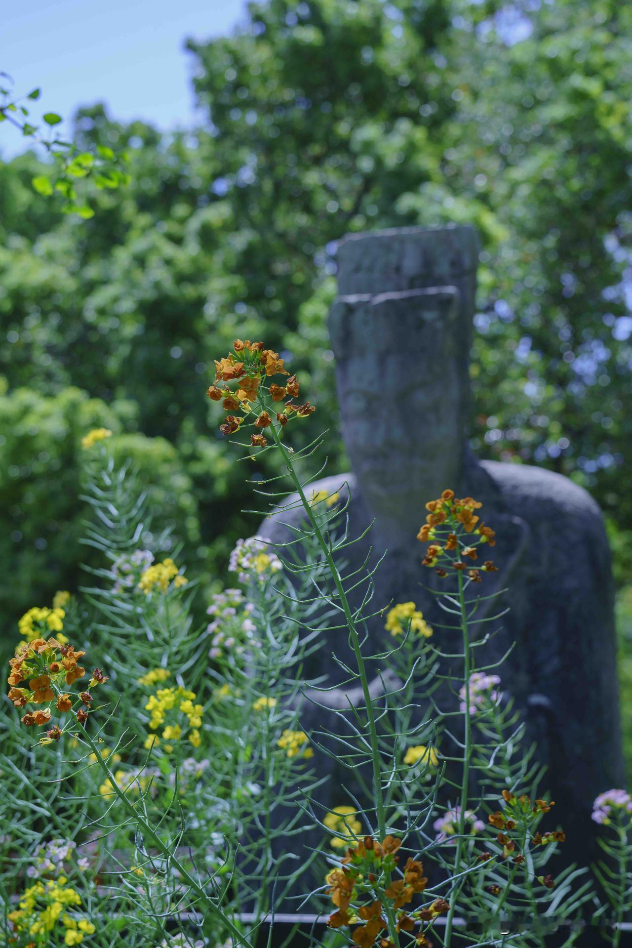 漫步花田之间,不经意便与隐匿于此的千年石刻相逢。古朴石刻静立岁月中,纹路沉静,与渐入尾声的花景相映,多了几分悠远意境。