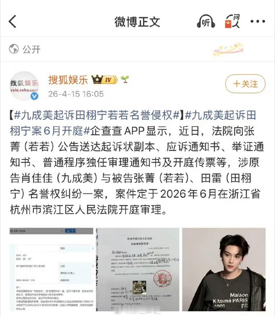 九成美起诉田栩宁若若名誉侵权