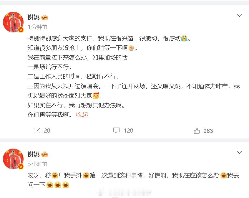 谢娜考虑演唱会加场 谢娜回应演唱会门票秒售罄:“哎呀,秒!我手抖第一次遇到这种事情,好慌啊,我现在应该怎么办我去问一下 ”她还透露目前在考虑加场,但有很多问题需要解决:“如果实在不行,我再想想其他办法啊。你们再等等我啊。”