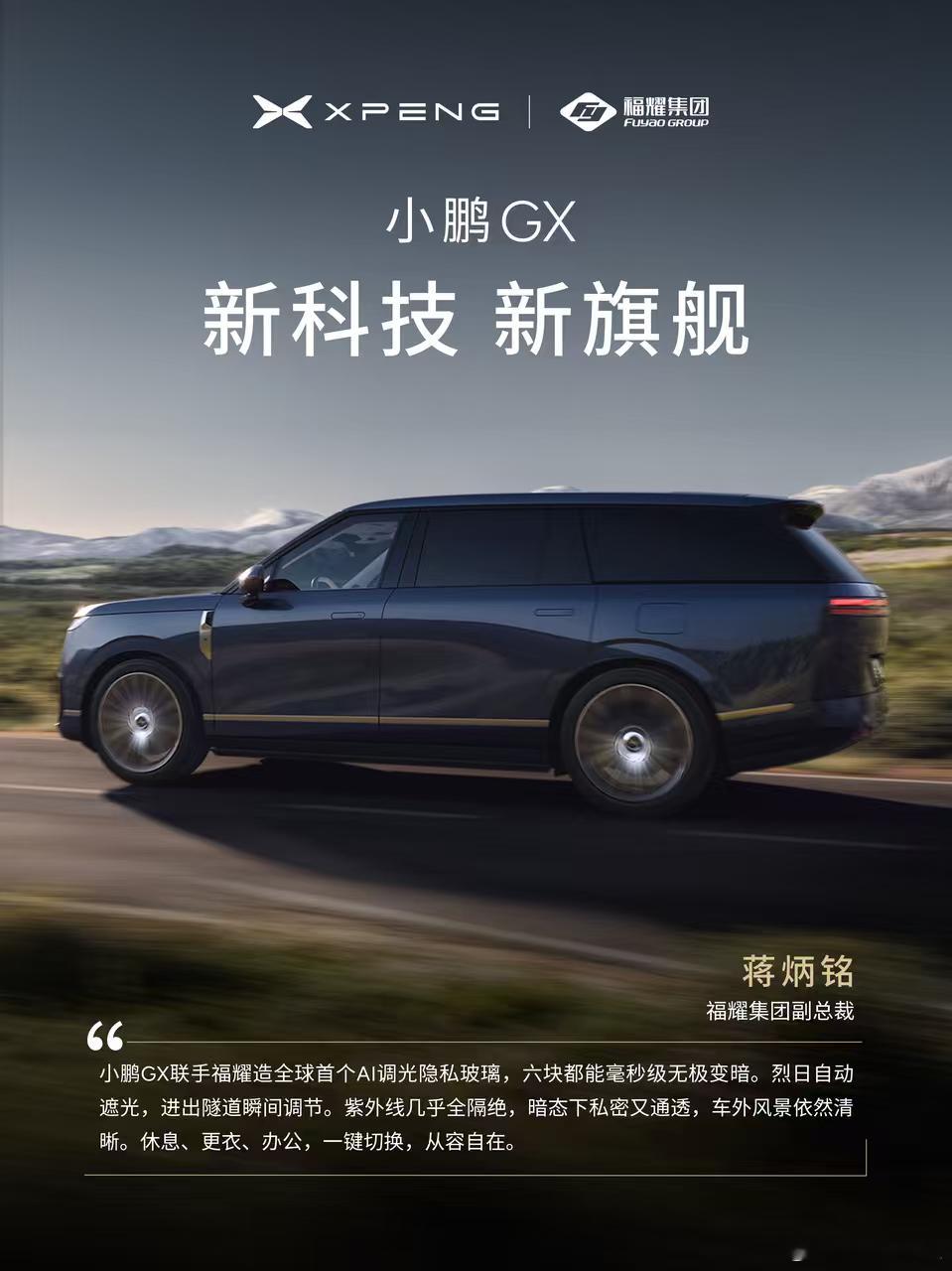 大湾区揽胜终于是要亮相了,我觉得今晚19:00的发布会除了小鹏GX首发评测外观内饰空间啥的之外,值得关注的是这台车是怎么做出来,关键部件的供应商都是谁,据说小鹏GX全车超90%零部件来自国内外头部供应商,包括博世华域最新一代线控转向,福耀首个AI调光隐私玻璃、华为乾崑AI投影大灯等等这些关键部件,而且现场这些供应商的高管还要为小鹏GX说两句,就看用了哪些首发的黑科技,我在现场会给大家同步,赶紧关注起来…….新科技旗舰小鹏GX今晚预售全球顶级供应链集体点赞小鹏GX