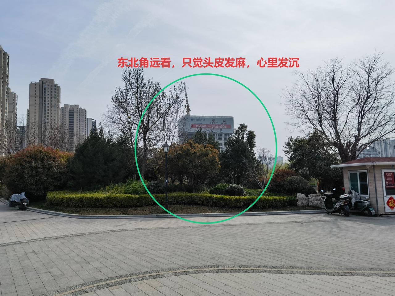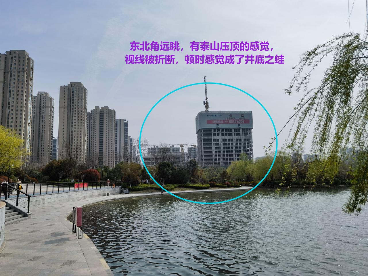 环顾四周,才发现东南角赫然冒出一大片建筑。正是这个“大家伙”,生生挡住了南来的紫气,让人顿感不畅。远远望去,那片建筑高耸突兀,占据了大片空间,让本就局促的小北湖更显逼仄。(见图一、图二、图三)