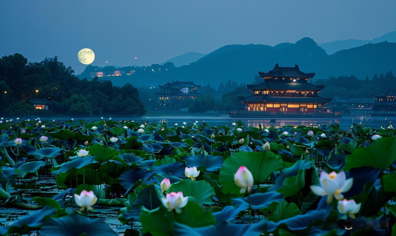 一池碧叶,半亩荷香。晨光里,粉荷垂露,白荷凝霜,在水波里漾开温柔的涟漪;暮色下,月照荷塘,灯映古榭,把江南的诗意揉进晚风。