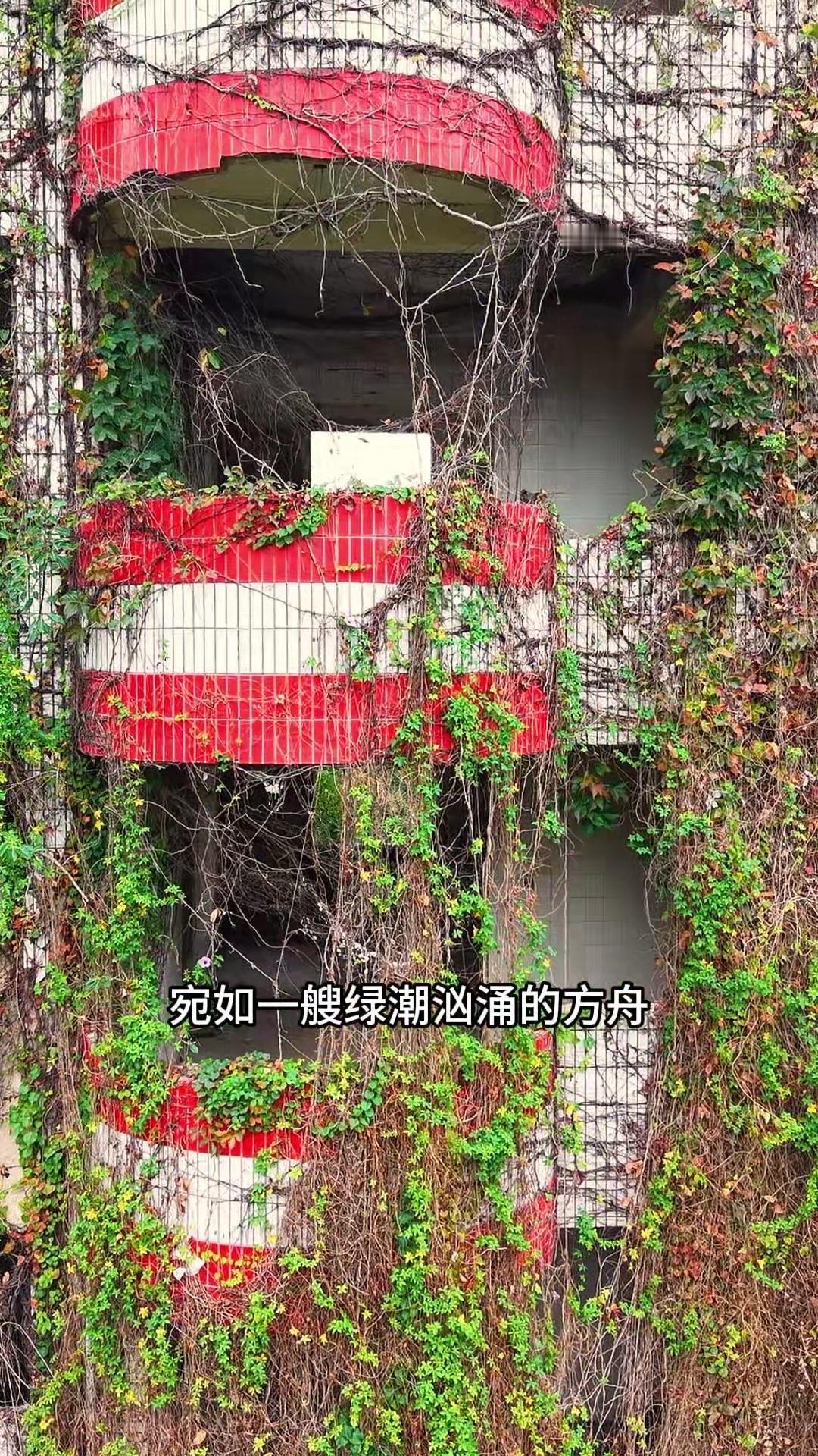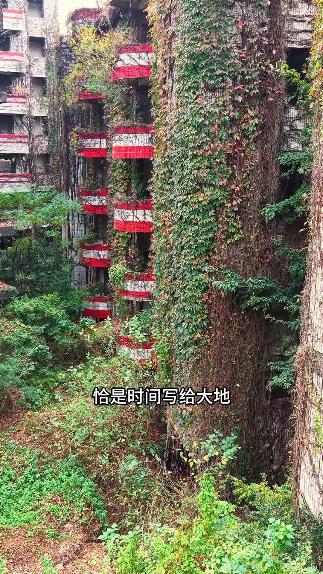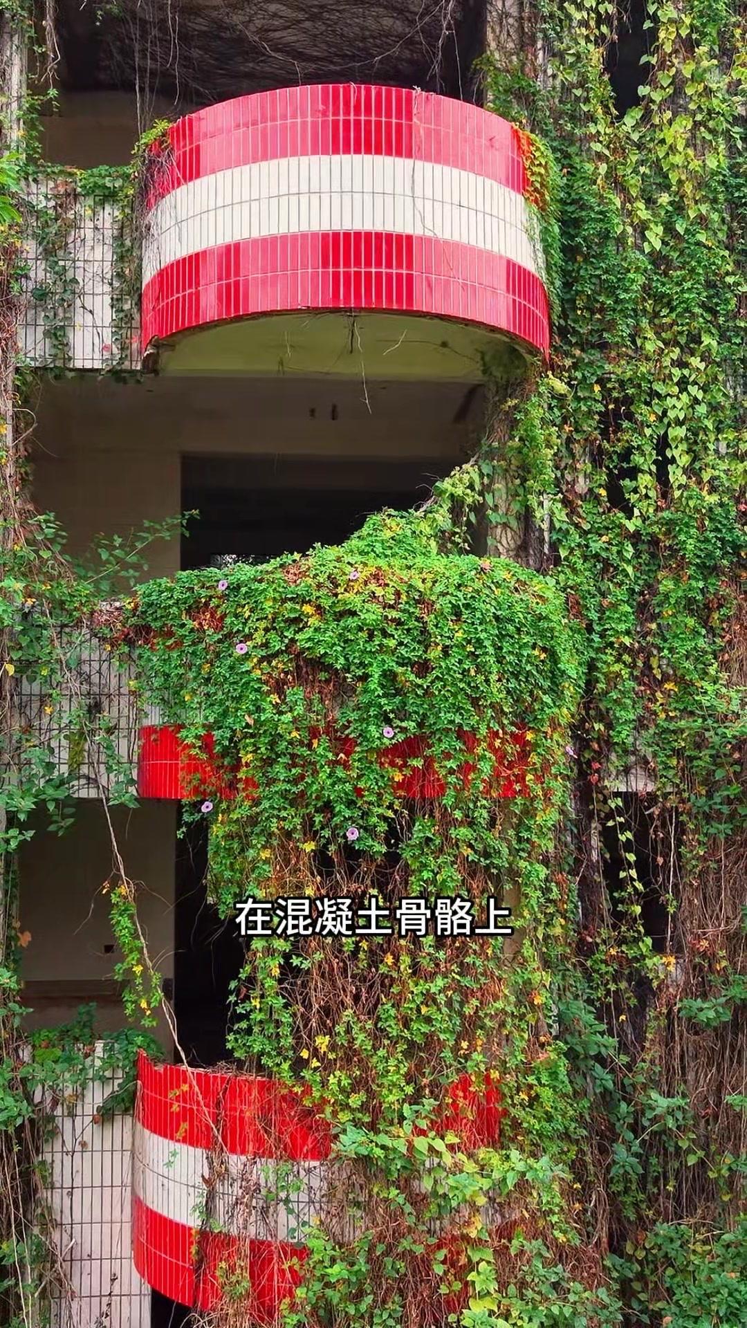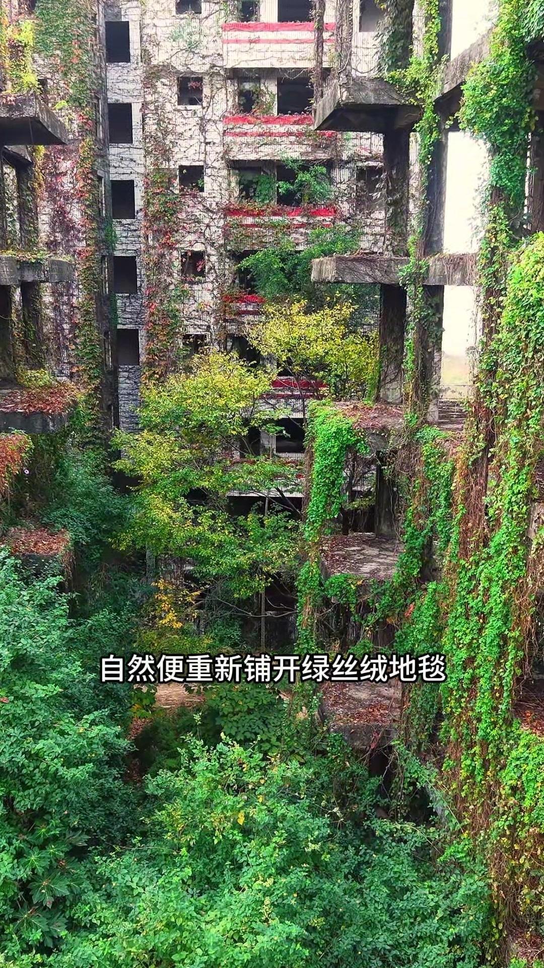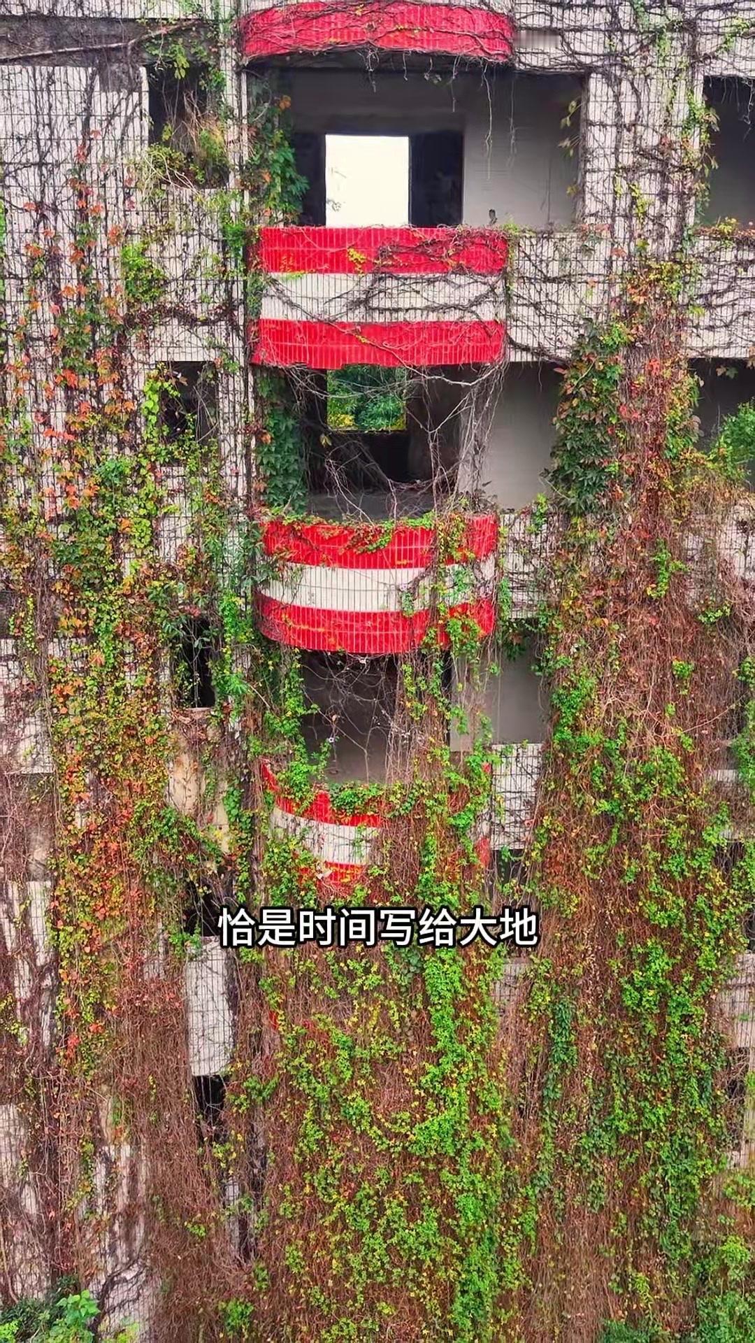 每一块水泥砖缝里都冒出倔强的野菊,藤蔓在阳台瀑布般垂落,连空调外机都被蕨类植物裹成绿宝石。人类遗弃的痕迹与自然的重生在这里共生,时间慢得像凝固的海浪,每道裂缝都开出新的故事。