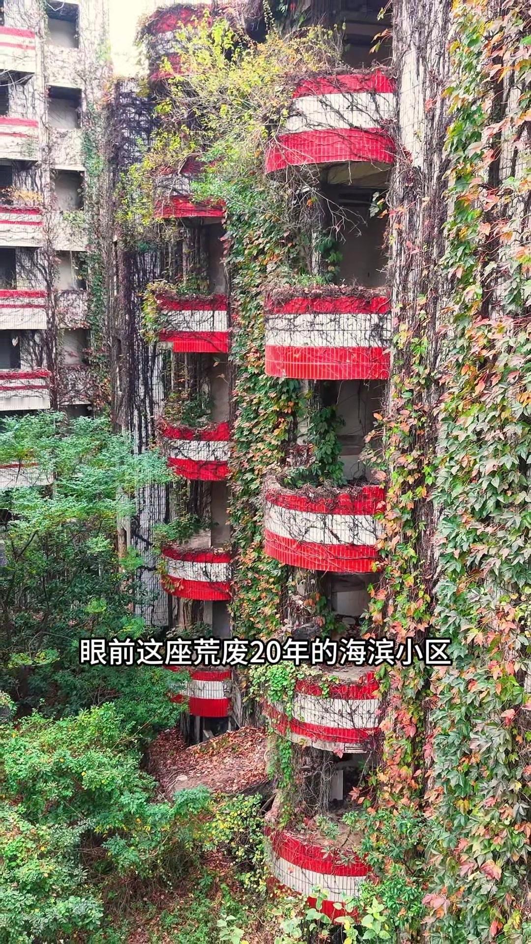 眼前这座荒废20年的海滨小区,宛如一艘绿潮汹涌的方舟,任由榕树细根织成门帘,藤蔓在阳台垂下瀑布。海风依旧推着浪花拍岸,当人类退场,自然便重新铺开绿丝绒地毯,在混凝土骨骼上生长出更蓬勃的生命力,这荒芜与繁盛交织的奇观,仿佛时间写给大地最动人的情书。