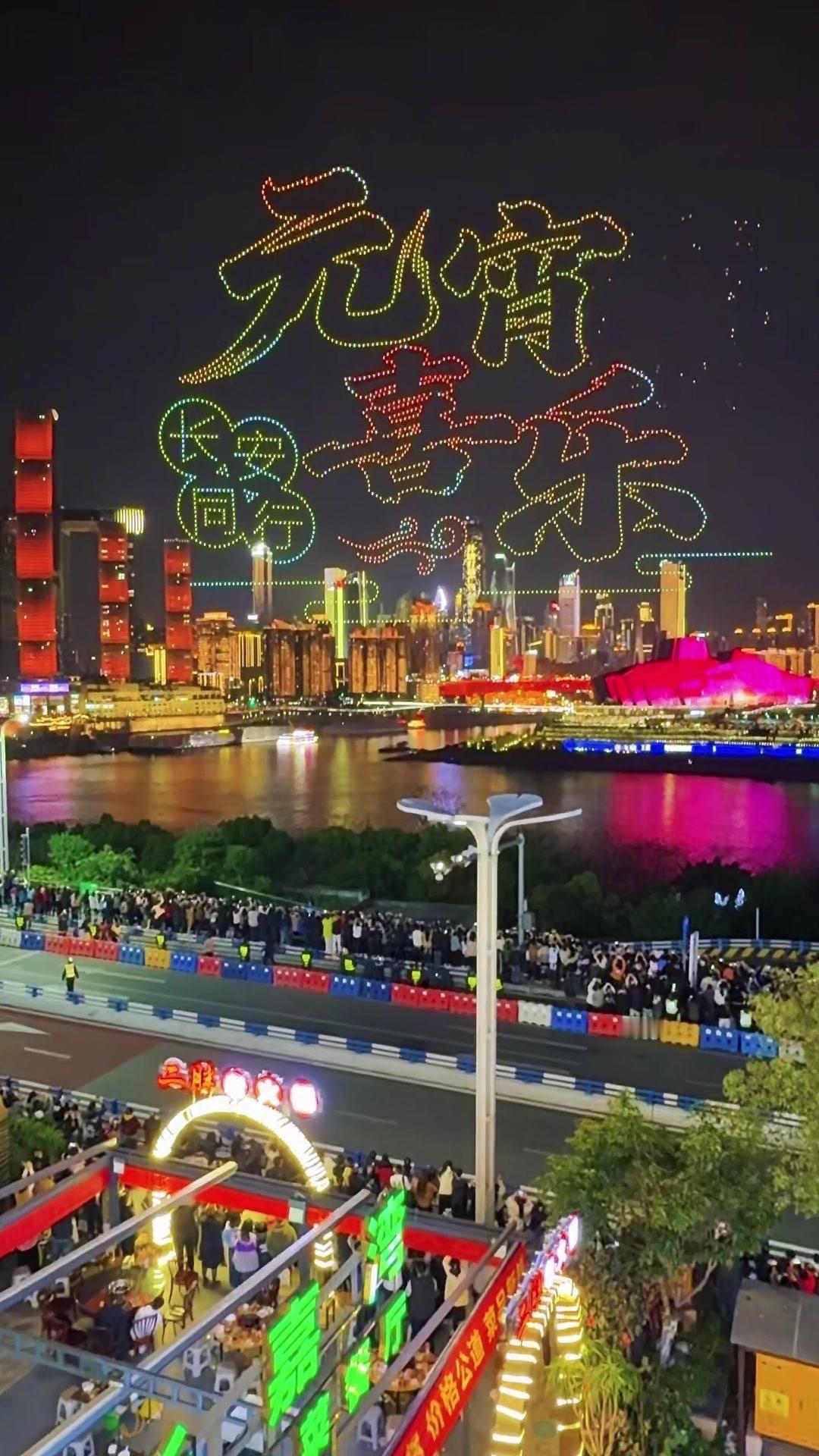 1️⃣无人机编队:从江面升空的那一刻,红金灯笼像流动的星河,福袋轨迹划出浪漫弧线,整个夜空都成了许愿池~