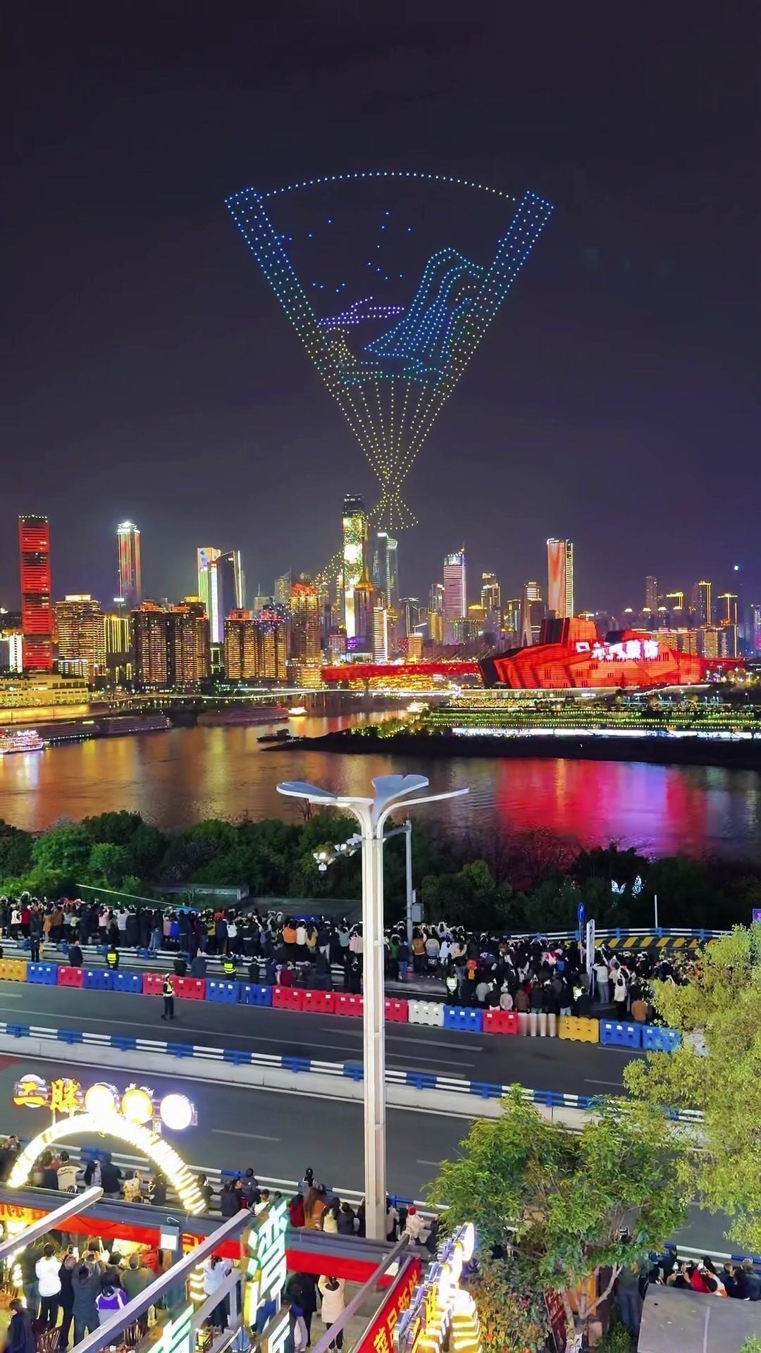 2️⃣光影交织:灯笼阵变换成“元宵快乐”“福满山城”等字样,无人机群组成的熊猫图案与山城夜景呼应,传统与科技碰撞的浪漫绝了~