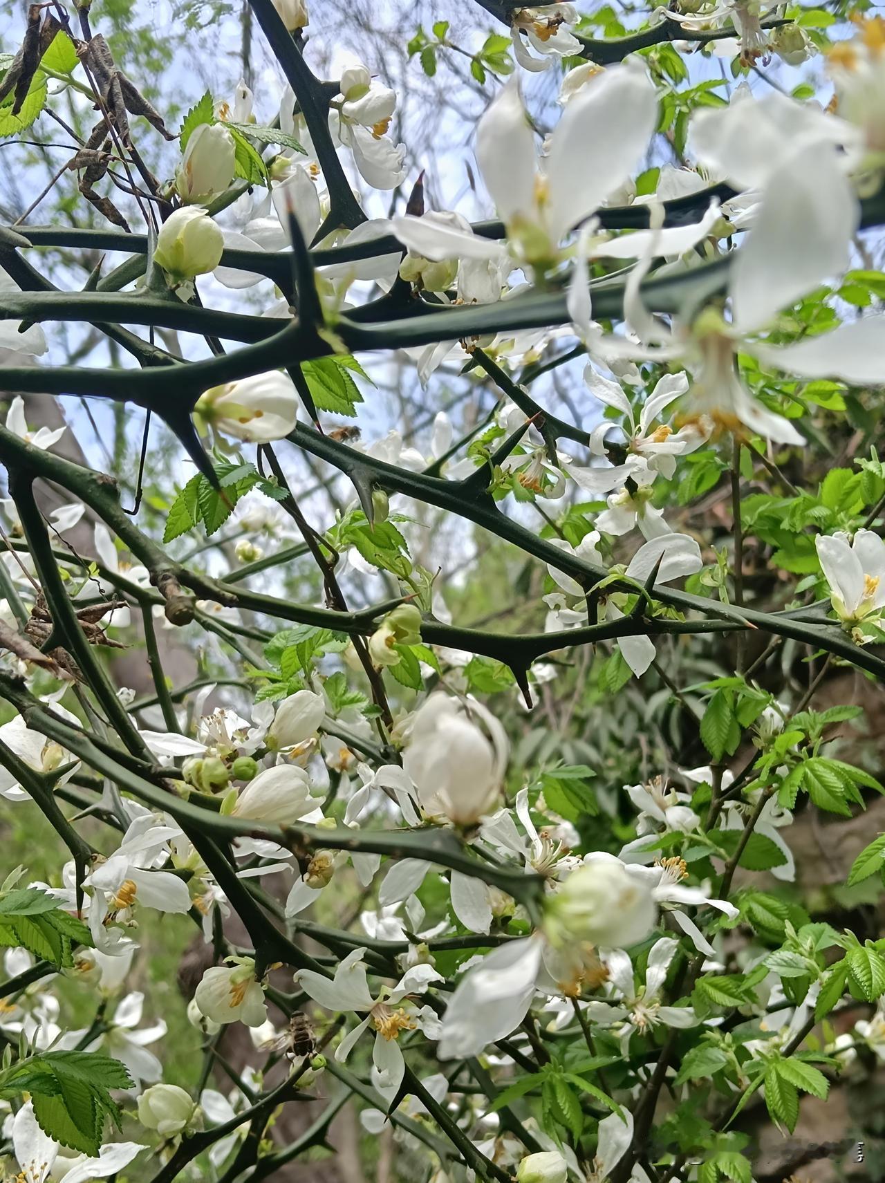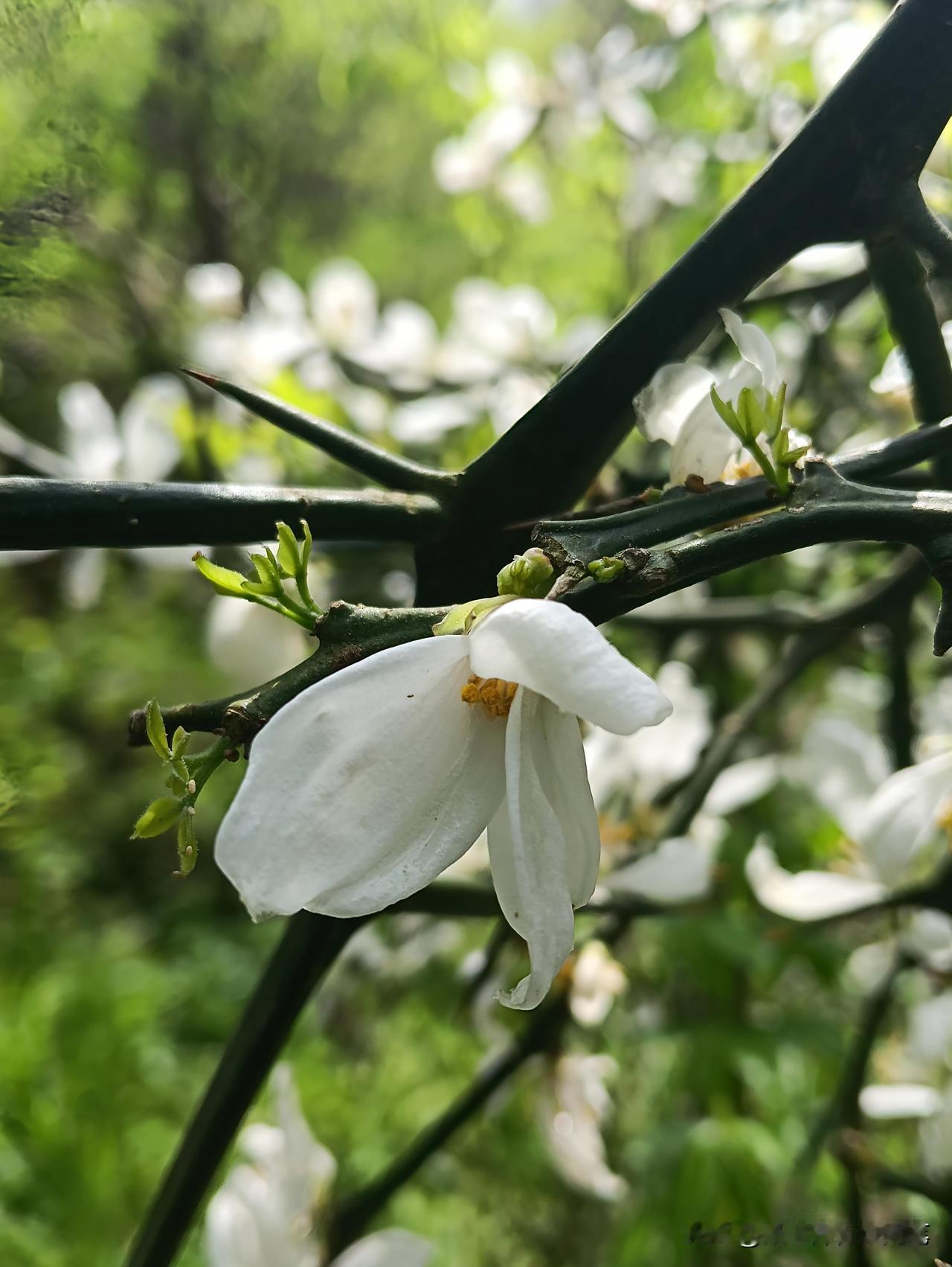 野线穿越,遇见一丛白花,手机识物说是枳花,又名枸橘。