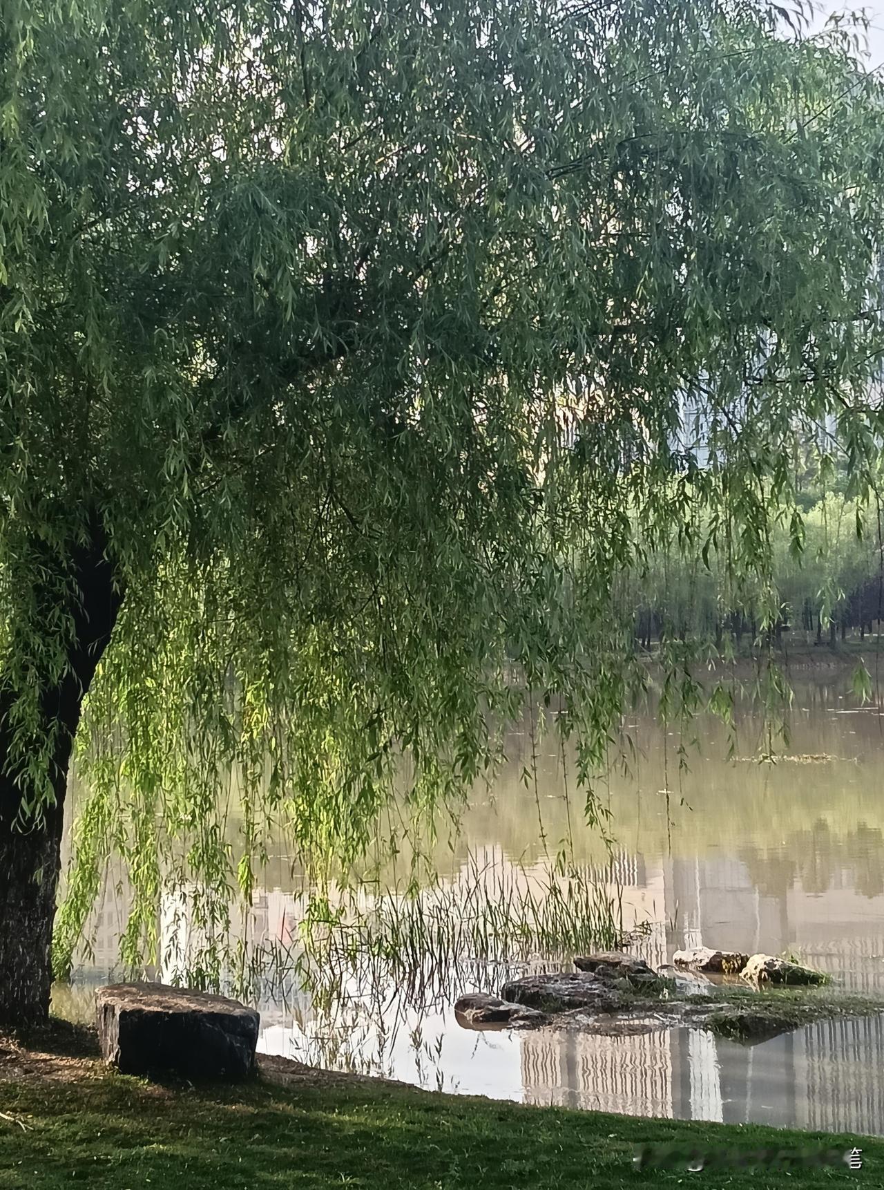 走着,手里的手机也不曾闲着。于是,那些泡在水里的柳,便一一地收进这方寸的相册里去了。