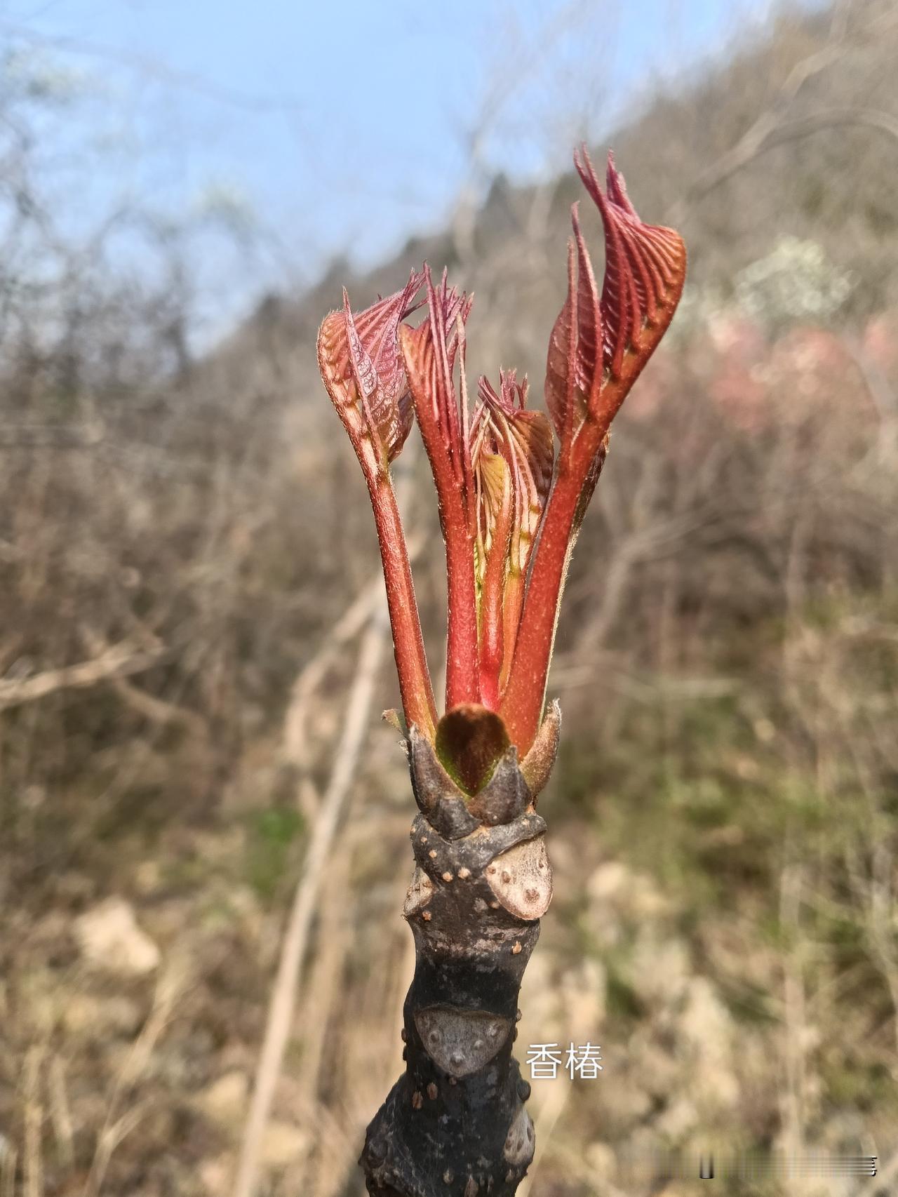 穿过树丛,不久即可见有野香椿已开始发芽。