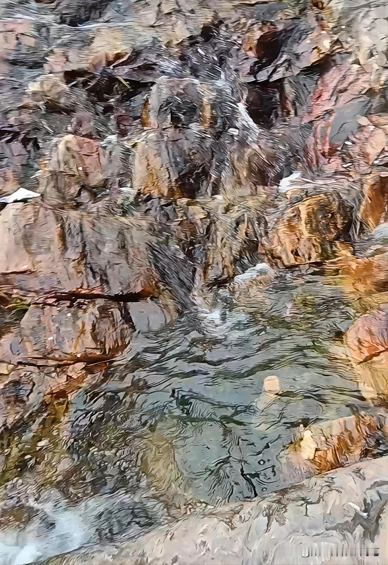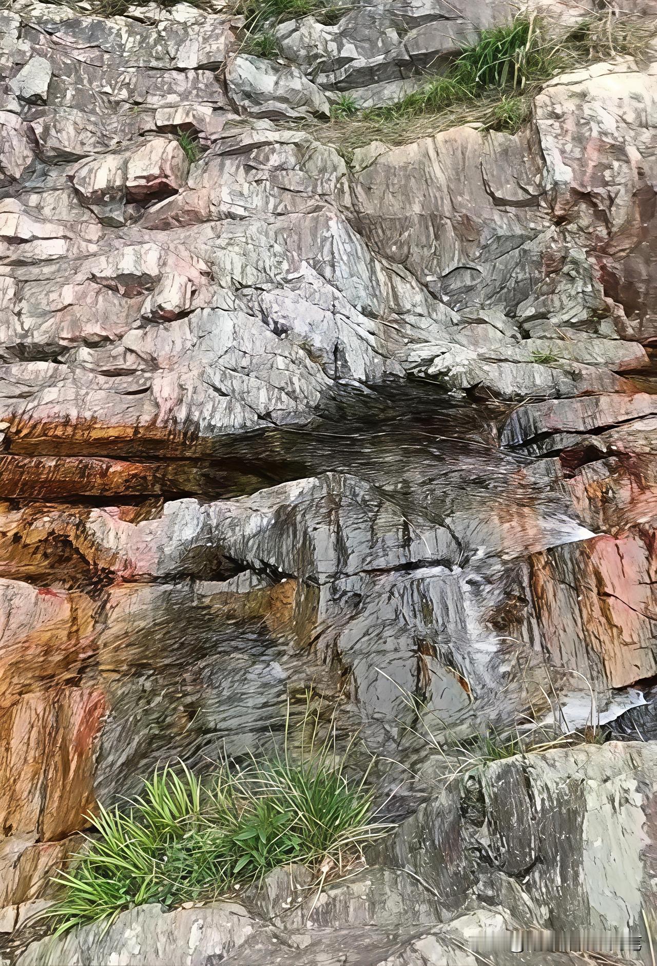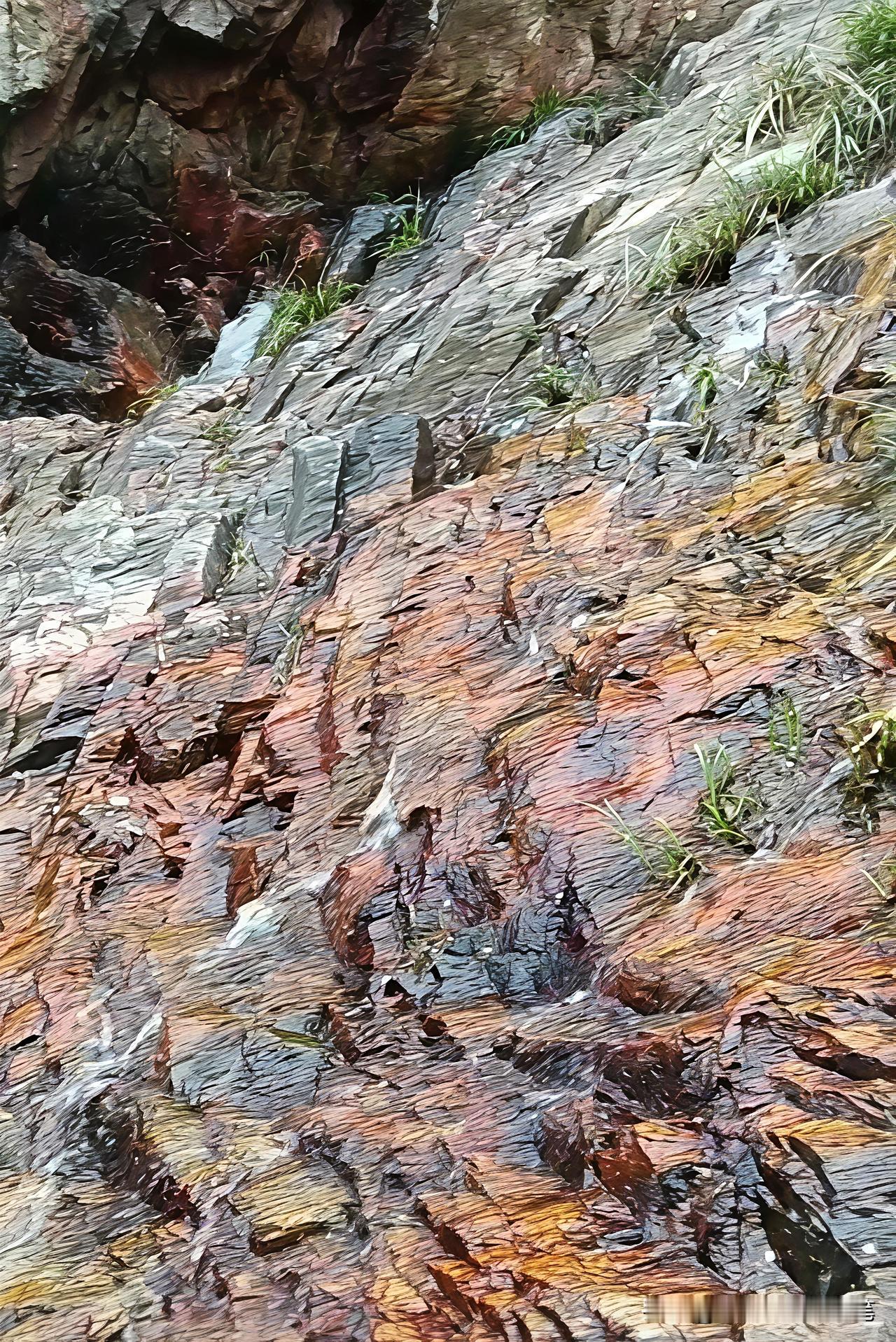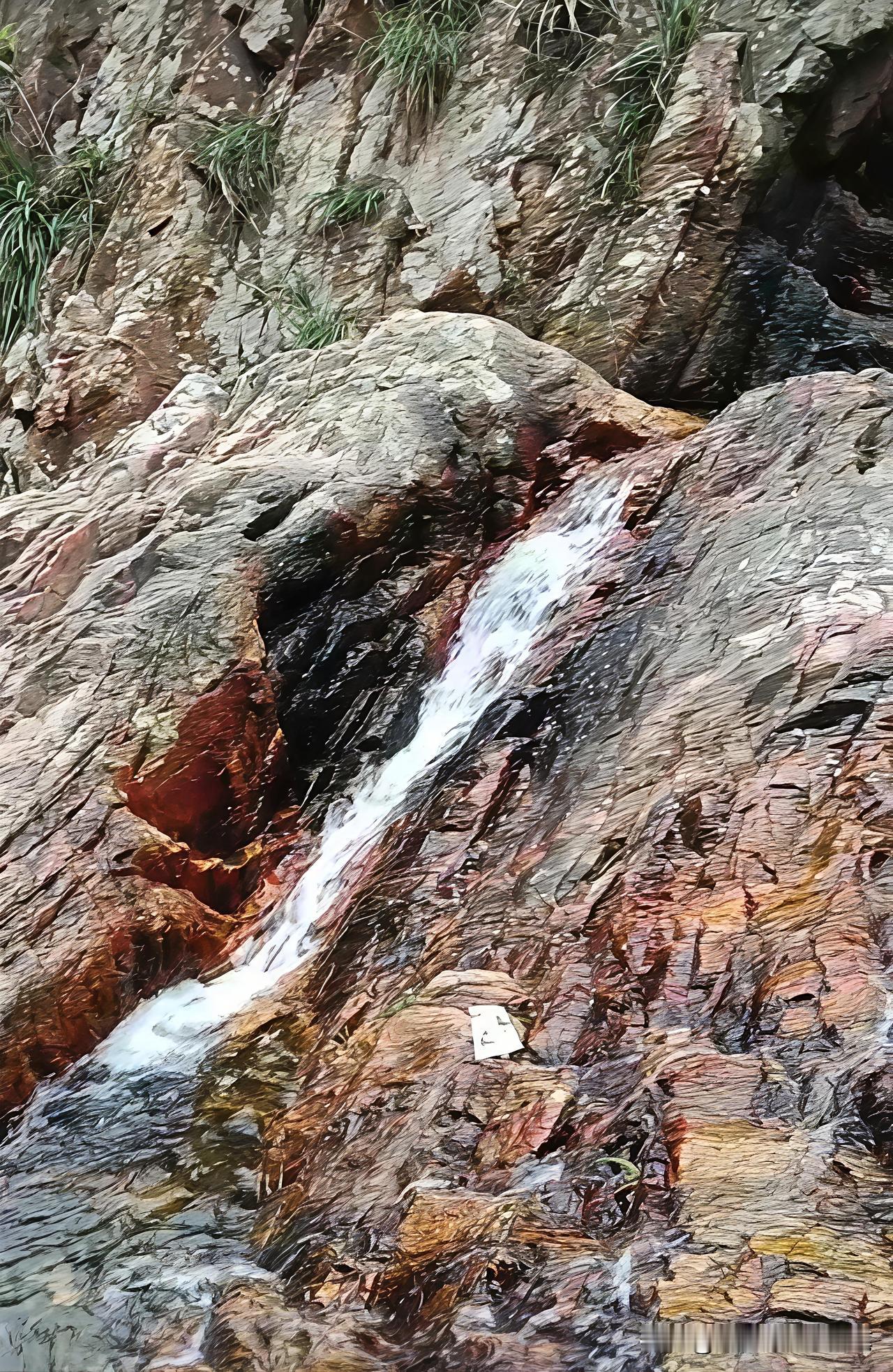 原本灰色的石头,有水流经过处,或呈铁红,或呈翠绿,或呈墨黑,或五颜六色……
