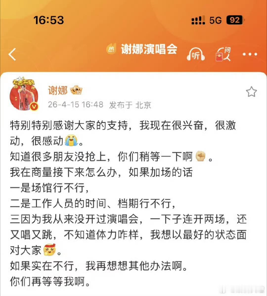 谢娜发文称考虑加场谢娜说很兴奋很激动很感动 拜托,这可是太阳女神