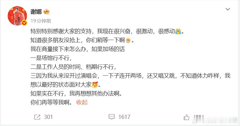 谢娜说会想办法加场 发回应演唱会售罄:“特别特别感谢大家的支持我现在很兴奋,很激动,很感动。”并表示考虑加场的问题,会尽力想想办法,期待娜姐~