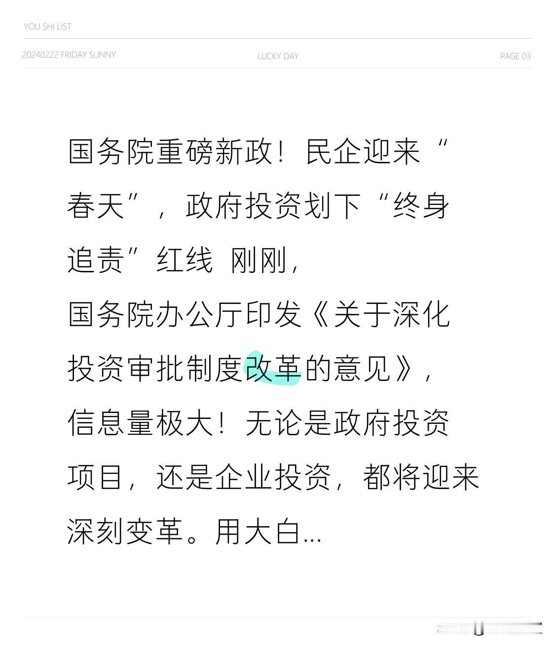 刚刚,国务院办公厅印发《关于深化投资审批制度改革的意见》,信息量极大!无论是政府投资项目,还是企业投资,都将迎来深刻变革。用大白话帮你划重点,尤其民企老板们,一定要看!
