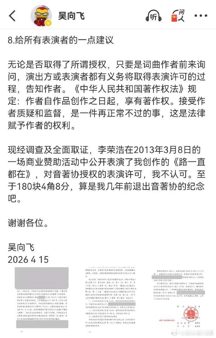 吴向飞发李荣浩相关情况说明吴向飞再发长文 15日,知名作词人吴向飞针对歌手李荣浩在2013年公开表演其作词作品《路一直都在》的版权争议发布长文回应。吴向飞在声明中详细梳理了当年演出的商业性质、白身版权维权诉讼的结果,并公开质疑了音著协(中国音乐著作权协会)及环球音乐公司的授权合法性问题。