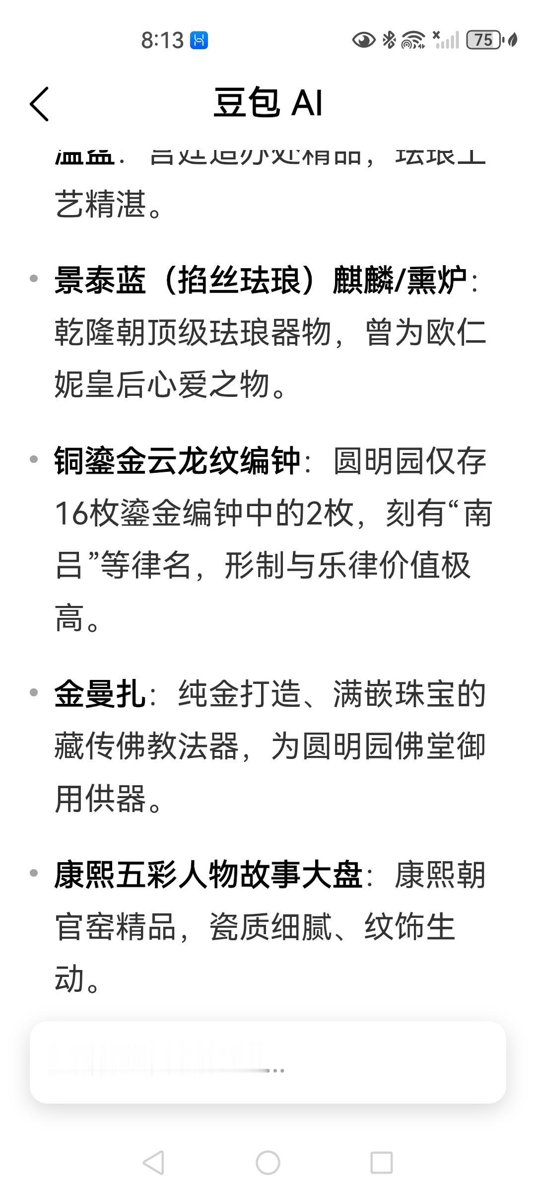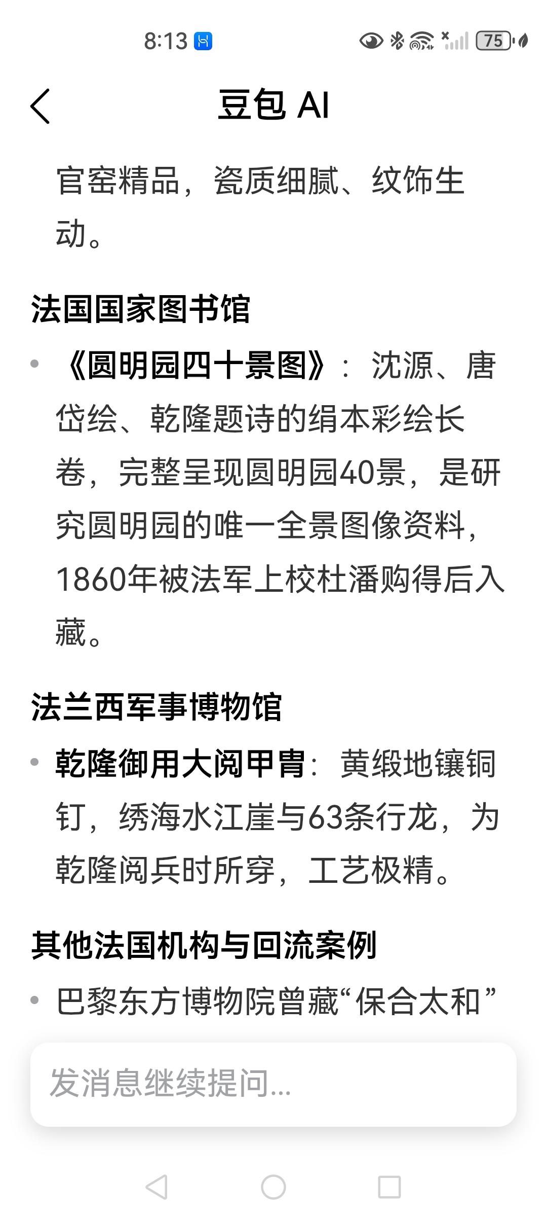 圆明园的文物该回家了, 我们老祖宗的这些宝贝被法国已经抢走了100多年,法国议会最近的表决以170票赞成,零票反对的结果,正式宣布这些文物回家,具体这些文物有什么呢?让我们拭目以待!那些参与抢劫圆明园的国家,包括了英国、美国等国,特别是日本在侵华战争时期,抢夺中国的文物,也必须提到日程上来!这是我查到的相关文物,肯定是不全面的,让文物专家补充一下这个名单。帝国主义抢走我们的文物,大部分是用来展览,他们只能展览,也创造不出金钱方面的价值,而中国人的历史是由中国人自己书写的,就西方那点历史,拿我们的文物做展览,肯定是不合时宜的,重要的是这些文物流落在海外,正在诉说中国过去被侵略的全部过程