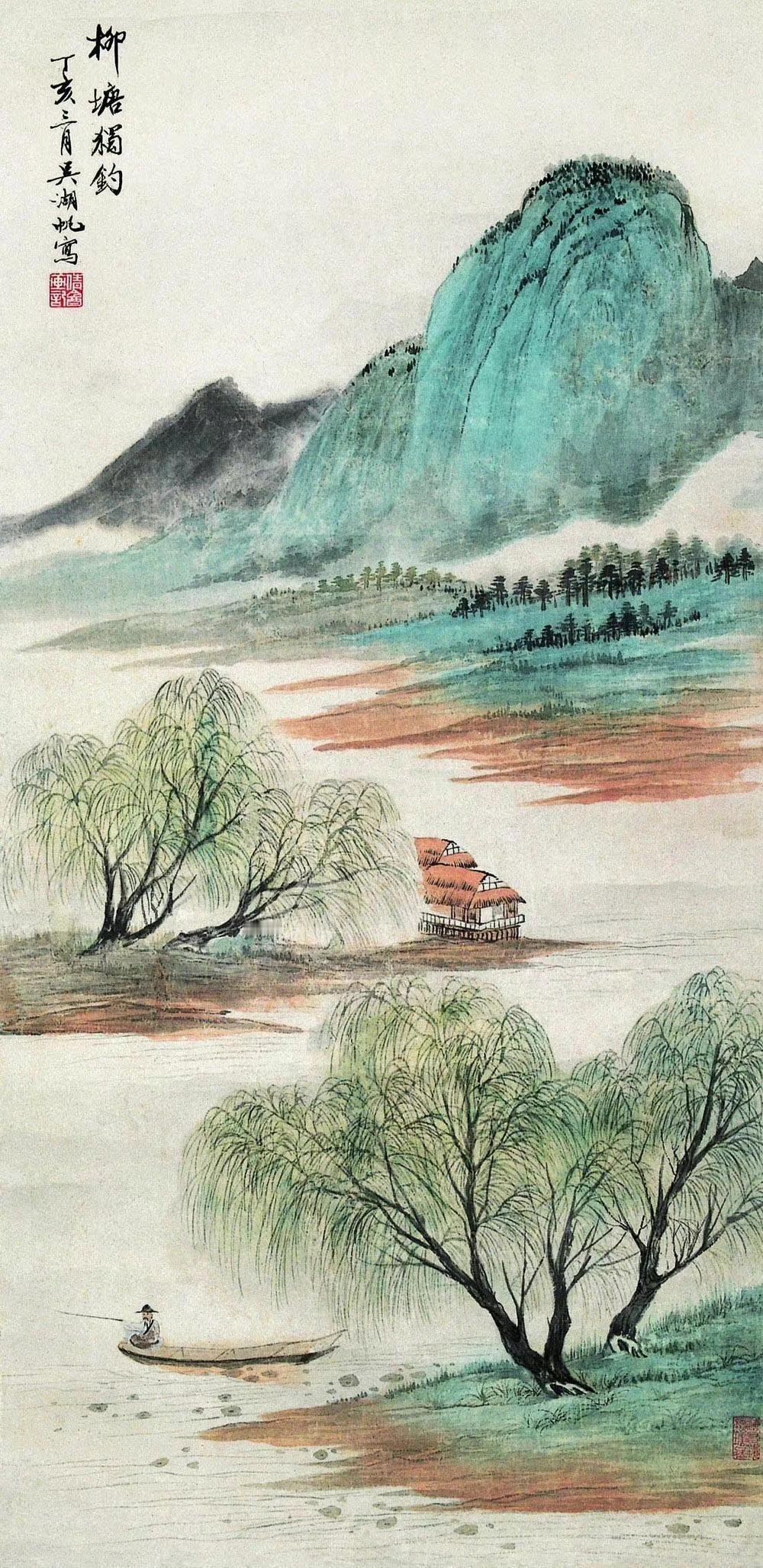 他的柳,远看朦胧如雾,近看层次极厚,被藏家称为“沾了江南湿气的绿”。