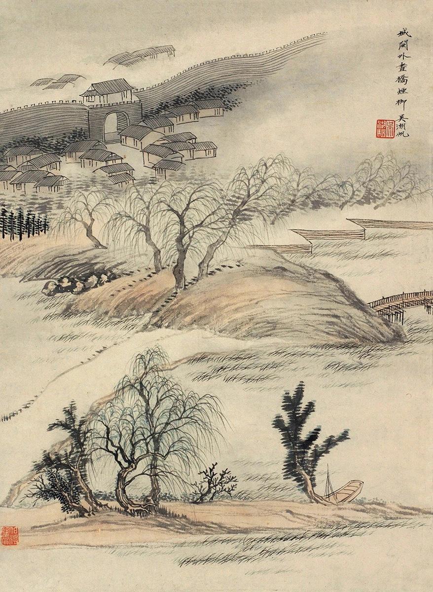 他的山水、柳树,全从古画+想象+书卷气来,反而更具古典雅致、不沾烟火。