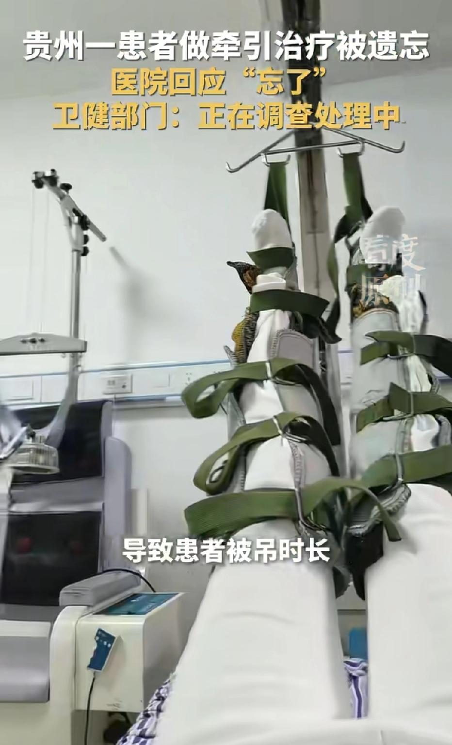 贵州仁怀,女子去医院做双腿牵引治疗,治疗时间20分钟,不料,计时器不响,女子多次呼喊,却无人应答,双腿被悬挂一个多小时,腿已发麻,女子只好呼叫朋友赶来,才叫来医护人员。