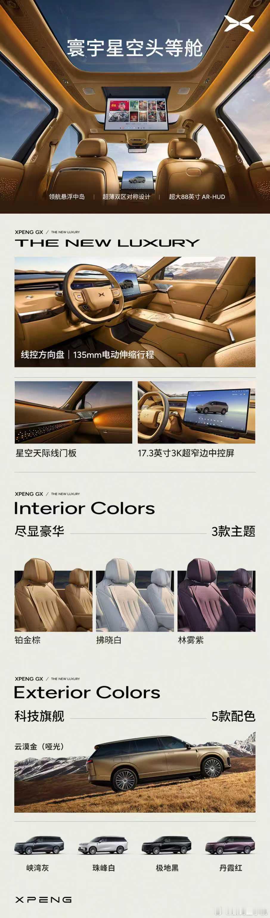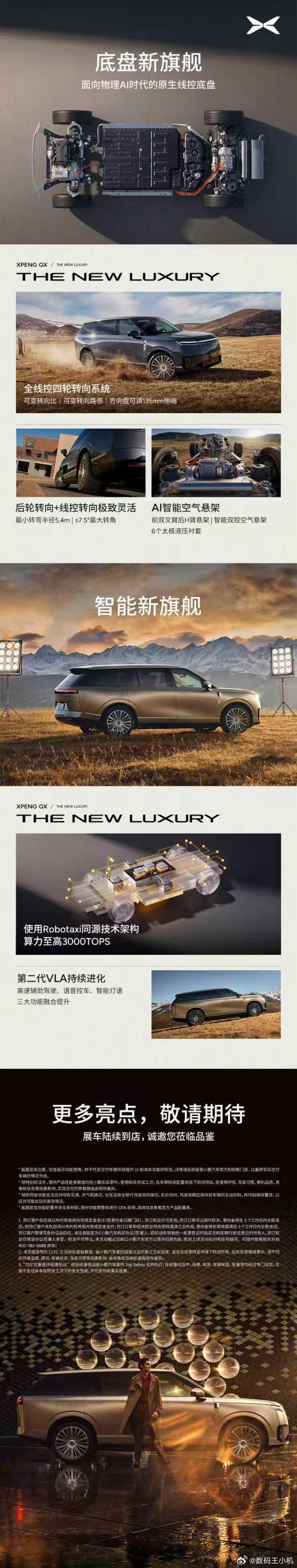 新科技,新旗舰。小鹏首款全尺寸旗舰SUV,硬核干货来啦!小鹏GX技术发布会核心亮点揭晓:安全新旗舰、操控新旗舰、智驾新旗舰、家庭新旗舰一图读懂,小鹏GX如何诠释“面向物理AI时代的科技大成之作”!安全新旗舰:小鹏GX的三大安全旗舰体系,城堡式车身安全,拥有有顶级的被动安全,“城堡式安全”车身结构,采用全球最大16000T前后一体大压铸技术,成功挑战720°五重连环碰撞测试。行业更强的AI智能主动安全组合,航空级六重全域安全冗余。操控新旗舰:面向物理 AI 时代的原生线控底盘,集成 X-VMC 智能融合系统、线控液压制动、线控转向、AI 智能悬架、智能四驱、线控后轮转向,全维度重构大车操控体验。智驾新旗舰:中国首款全栈自研的Robotaxi量产车型,第二代VLA智驾系统持续进化,智驾、语音、灯语深度融合。支持园区漫游能力,可应对雨雾、暗光场景。支持本地大模型,实现模拟语义对话。家庭新旗舰:全球唯一三排电动三折叠,座座皆C位,排排可躺平。同级最大的后备箱空间、最快响应的AI隐私玻璃、适合健康家庭的AI无菌风冷双开门冰箱、同级领先的2把零重力和1把飞航舒享座椅。小鹏GX正式开启预售,39.98万元!欢迎大家下定。新科技旗舰小鹏GX预售39.98万央视称小鹏GX为科技大成之作