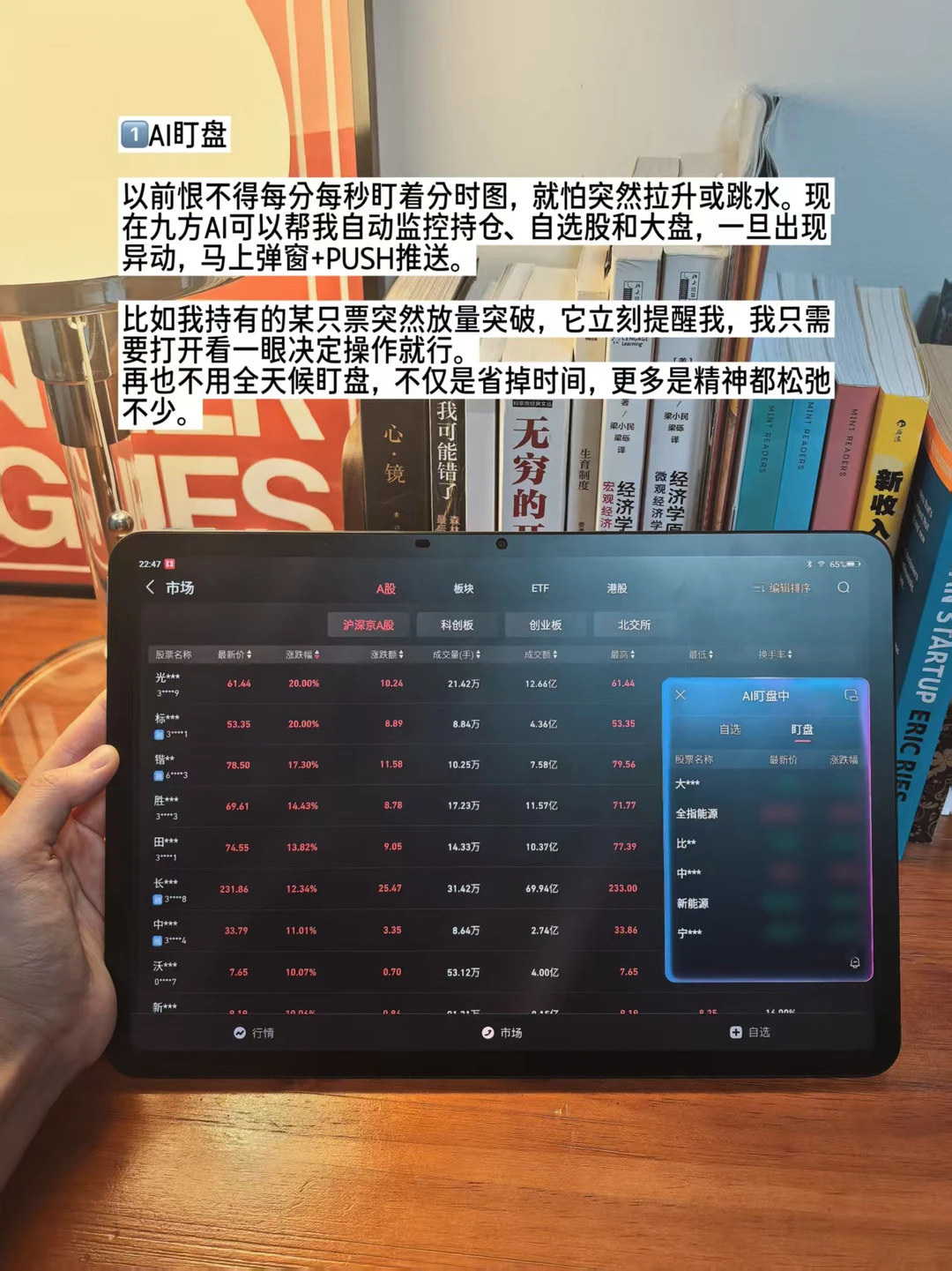 比如持有的某只票突然放量突破,它立刻提醒,我只要打开看一眼决定操作就行,不用全天候盯盘,不仅是省掉时间,更多是精神都松弛不少。