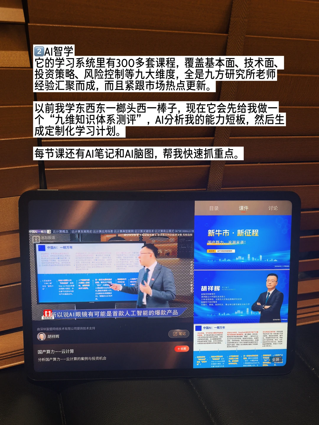 学习机里有300多套课程,覆盖基本面、技术面、风险控制等九大维度,而且紧跟热点更新。以前我学东西东一榔头西一棒子,现在它会先给我做一个“九维知识体系测评”,【AI测评】分析我的能力短板 ,再生成定制学习计划,每节课还有AI笔记和AI脑图总结。
