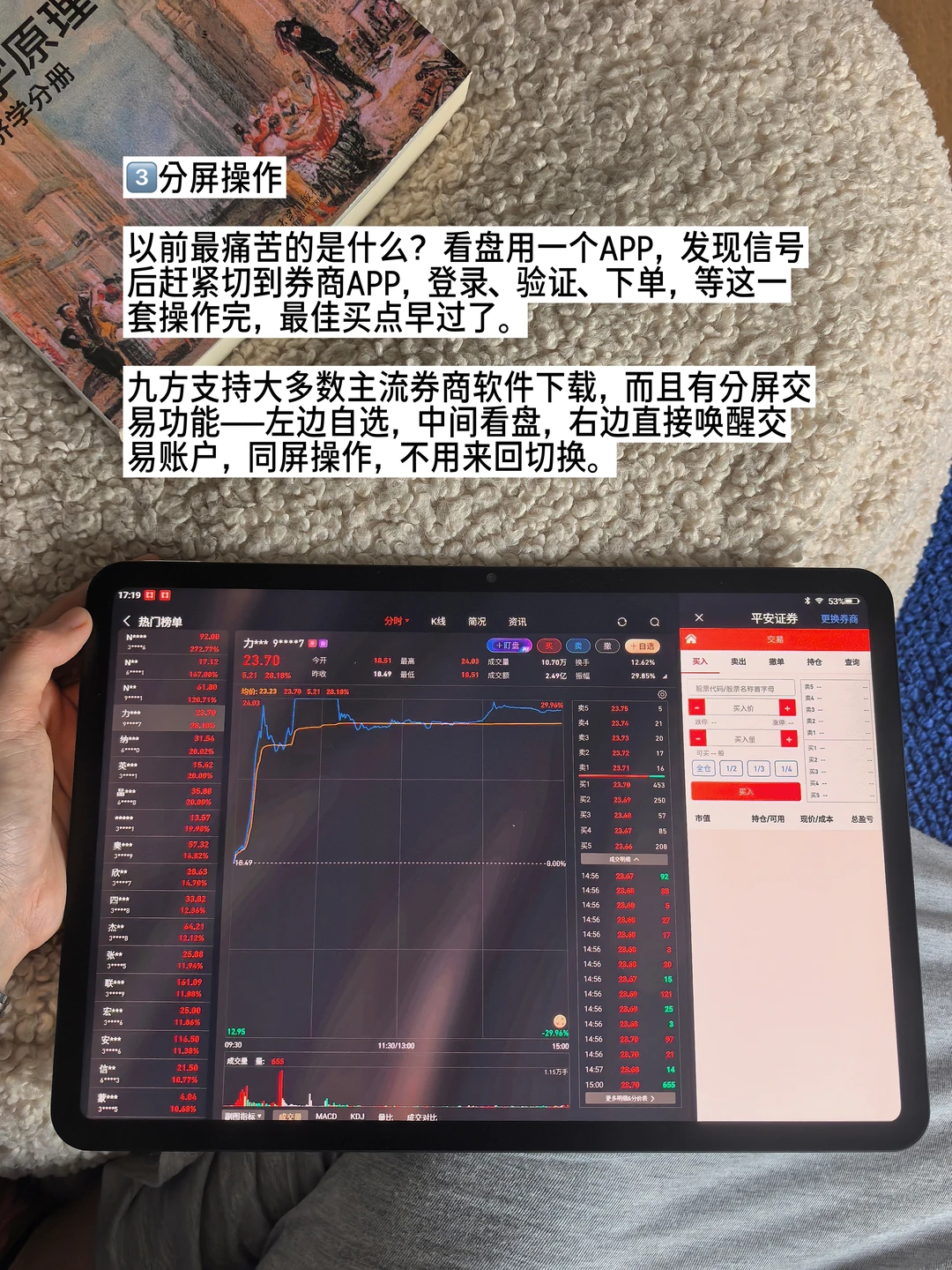 以前最痛苦看盘用一个APP,发现信号后切到券商,登录、验证、下单。这一套操作完,最佳买点早过了。九方AI股票机支持大多数主流券商,而且有分屏交易功能——左边自选,中间看盘,右边直接唤醒交易账户,同屏操作,不用来回切换。