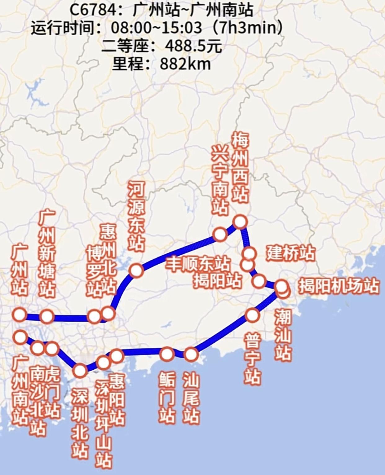 “广广环线”,票价,二等座:488.5元起!起点从广州南站出发,途径佛山西站,南沙北 ,虎门 ,深圳北,深圳坪山,惠阳 ,鲘门 ,汕尾 ,潮阳 ,潮汕 ,揭阳机场 ,揭阳 ,梅州西 ,惠州北 ,广州新塘 ,终点广州火车站,全程耗时约 6-7个半小时。