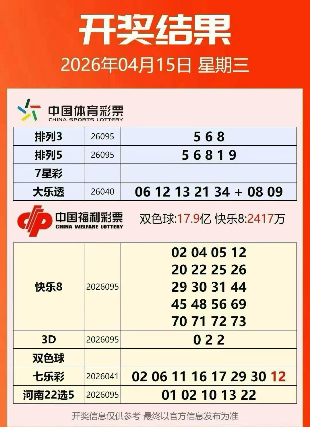 4月15号星期三,大乐透开奖号码公布:06、12、13、21、34—08、09。