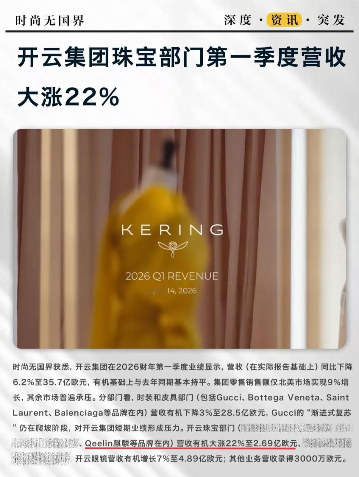 开云集团2026年最新财报表示珠宝部门营收大涨22%,Qeelin卖得不错。自刘
