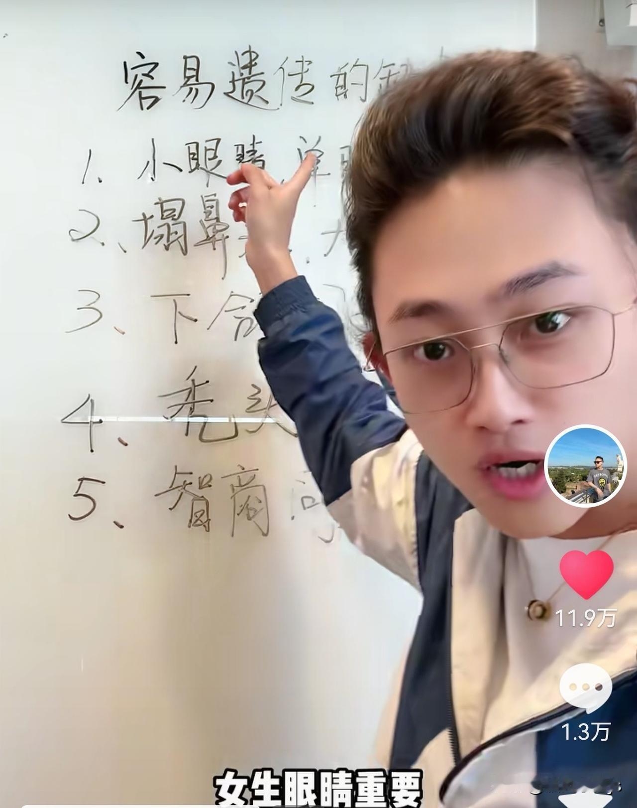 ●先说小眼睛单眼皮,他提到男鼻女眼,女生眼睛重要。不过从遗传学看,大眼睛基因更容易遗传,只要父母一方有大眼睛基因,孩子就有较高概率继承大眼睛特征。