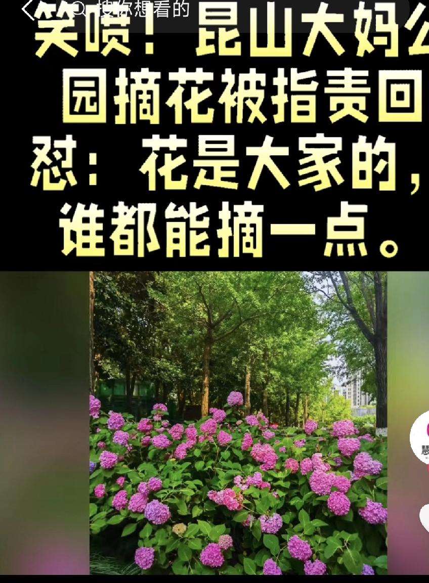 江苏昆山,一女子在公园溜娃,看见一大妈把好看地花都摘了,手中已经捧着一大束花,女