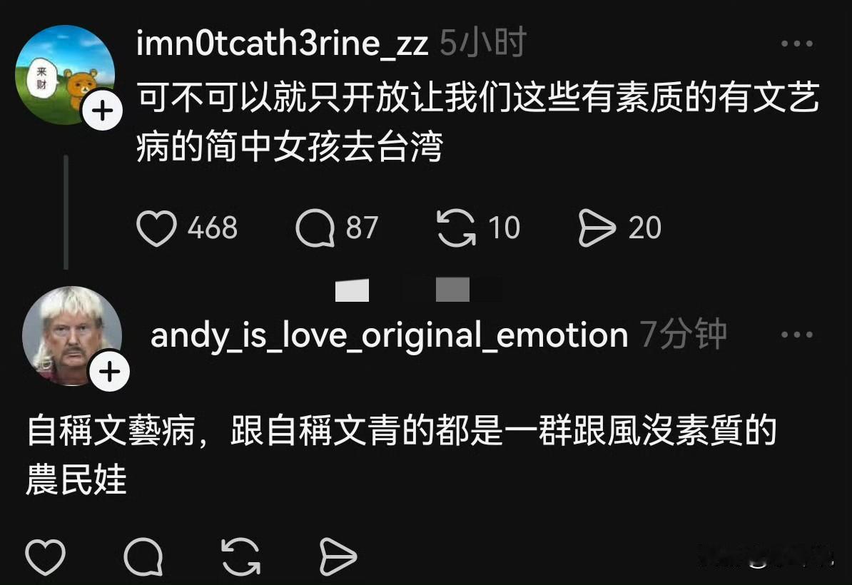国内的一个女孩在外网发帖,“希望只让她们这些有素质的文艺女孩去台湾” !结果被台