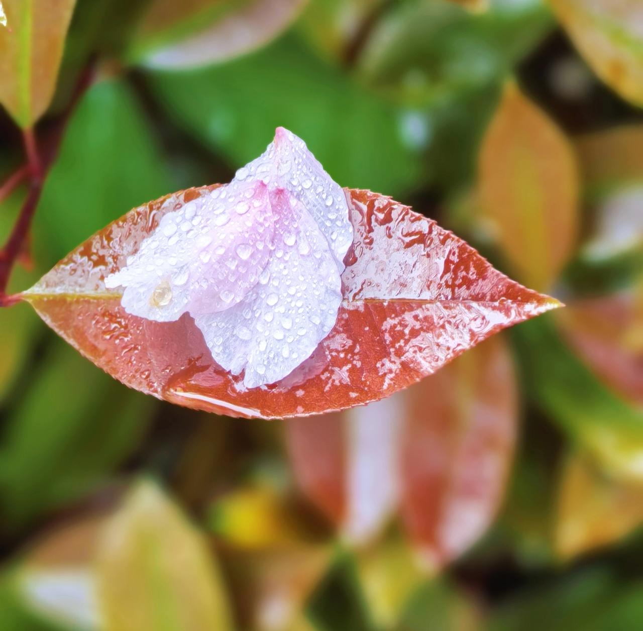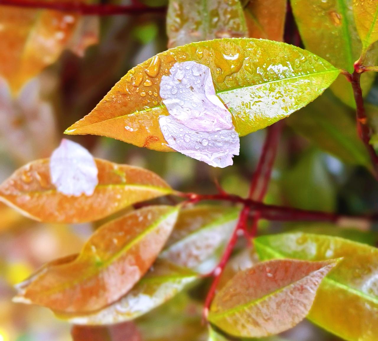 新叶衔雨, 晕开江南的水墨春烟。 撑伞走过巷口, 看雨打叶尖, 弹醒一整个春天