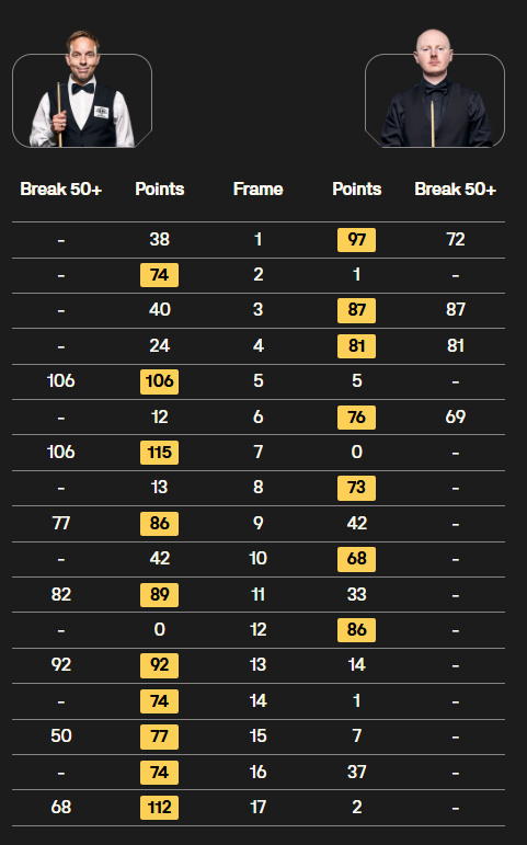 卡特表示:“安东尼打得十分自如,我知道自己必须紧咬比分。能晋级我很高兴,46岁还能在赛场上竞争,这本身就是一项了不起的成就。过去一年,我在赛场外经历了诸多变故,但如今一切已尘埃落定,我可以专心打斯诺克了。这很艰难——我们都有各自的生活,要照顾孩子和家庭,而如今巡回赛赛程繁忙,这就像走钢丝一样需要平衡好一切。”