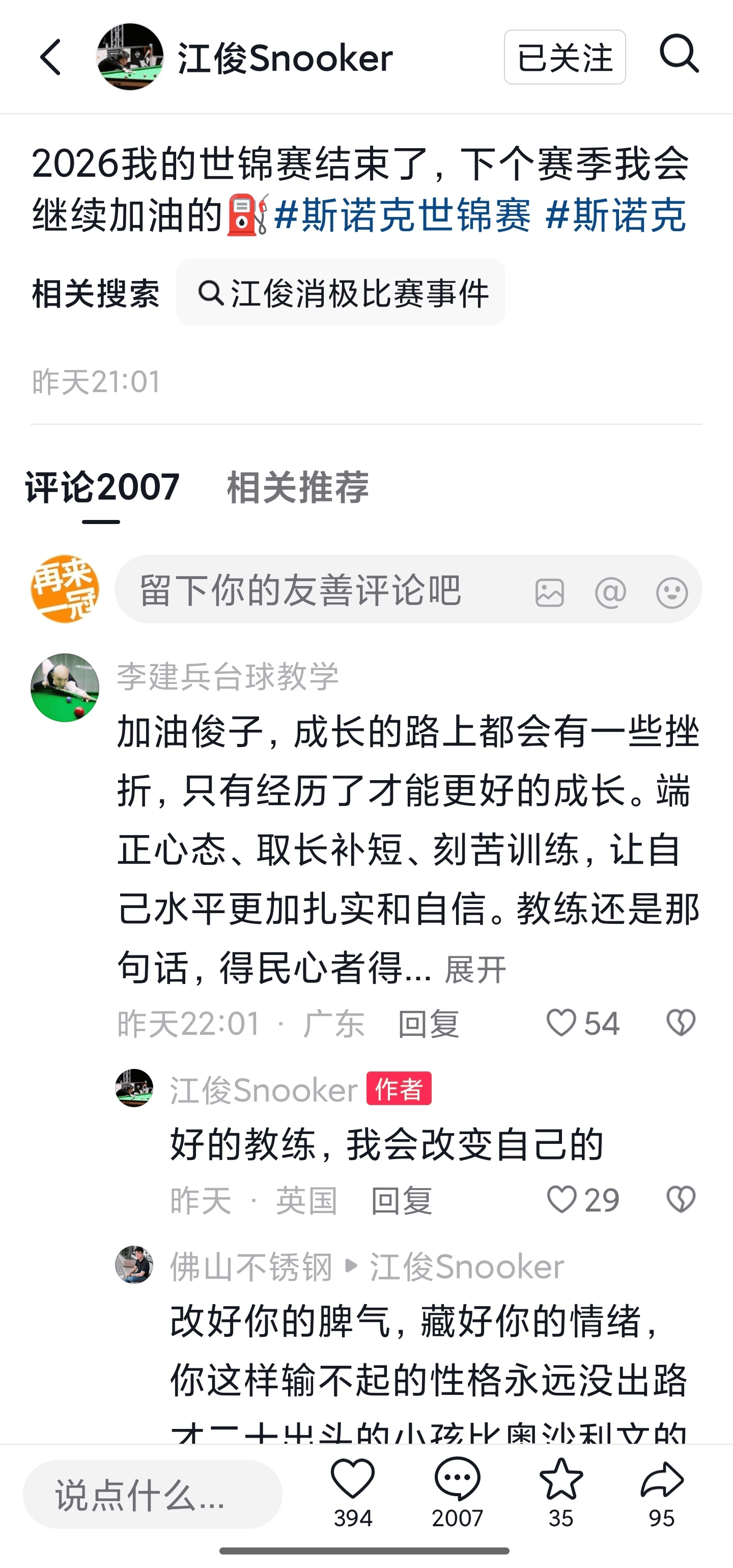虎扑04月16日讯据微博体育博主@瓶盖说的动态,中国斯诺克球员江俊更新社媒动态,为没有在斯诺克世锦赛资格赛末轮比赛里管理好自己的情绪进行反思。