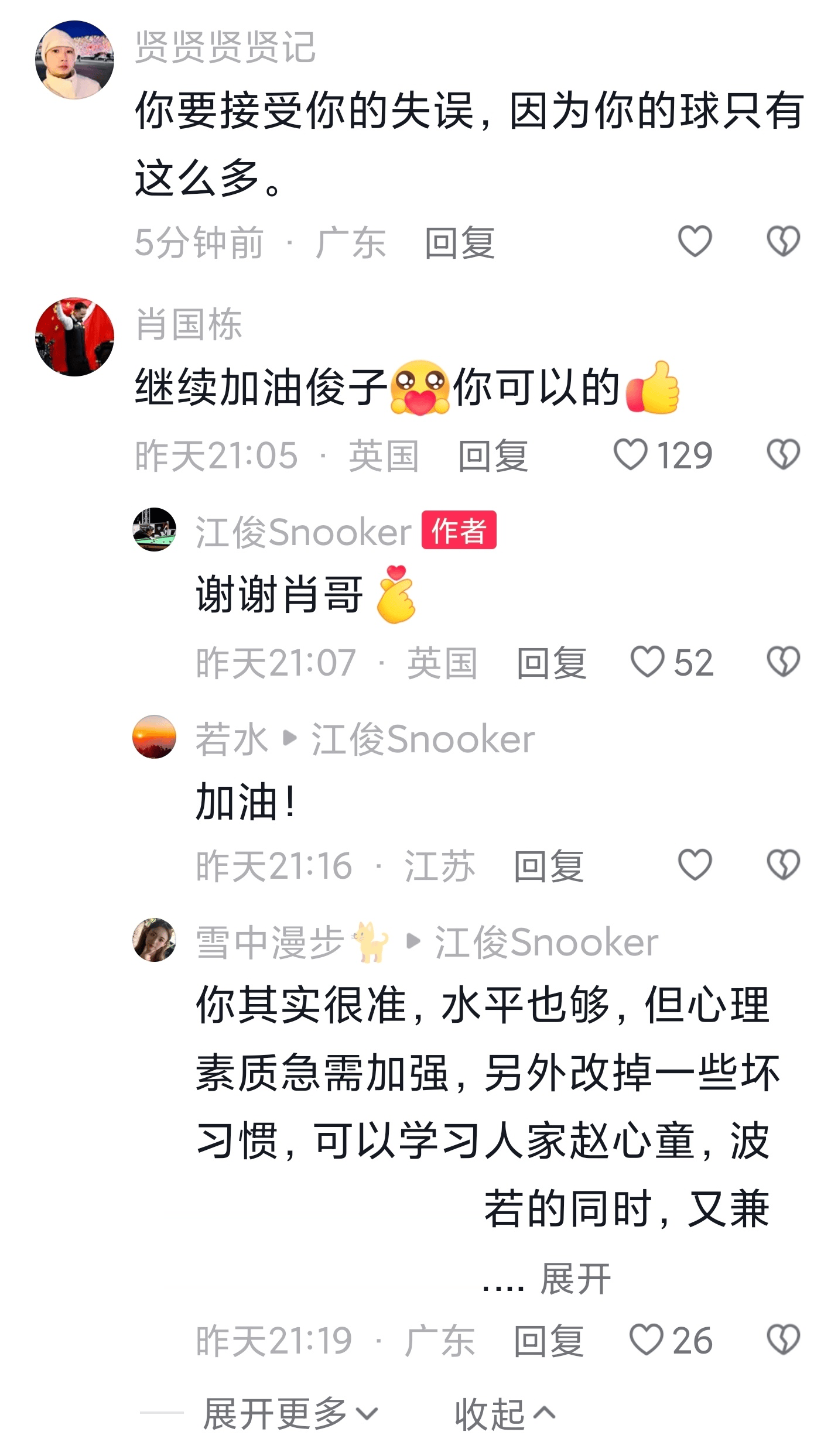 他在动态里表示会慢慢改正,争取做一位优秀的斯诺克球员。斯诺克教练李建兵、球员肖国栋等人在其评论区留言支持。