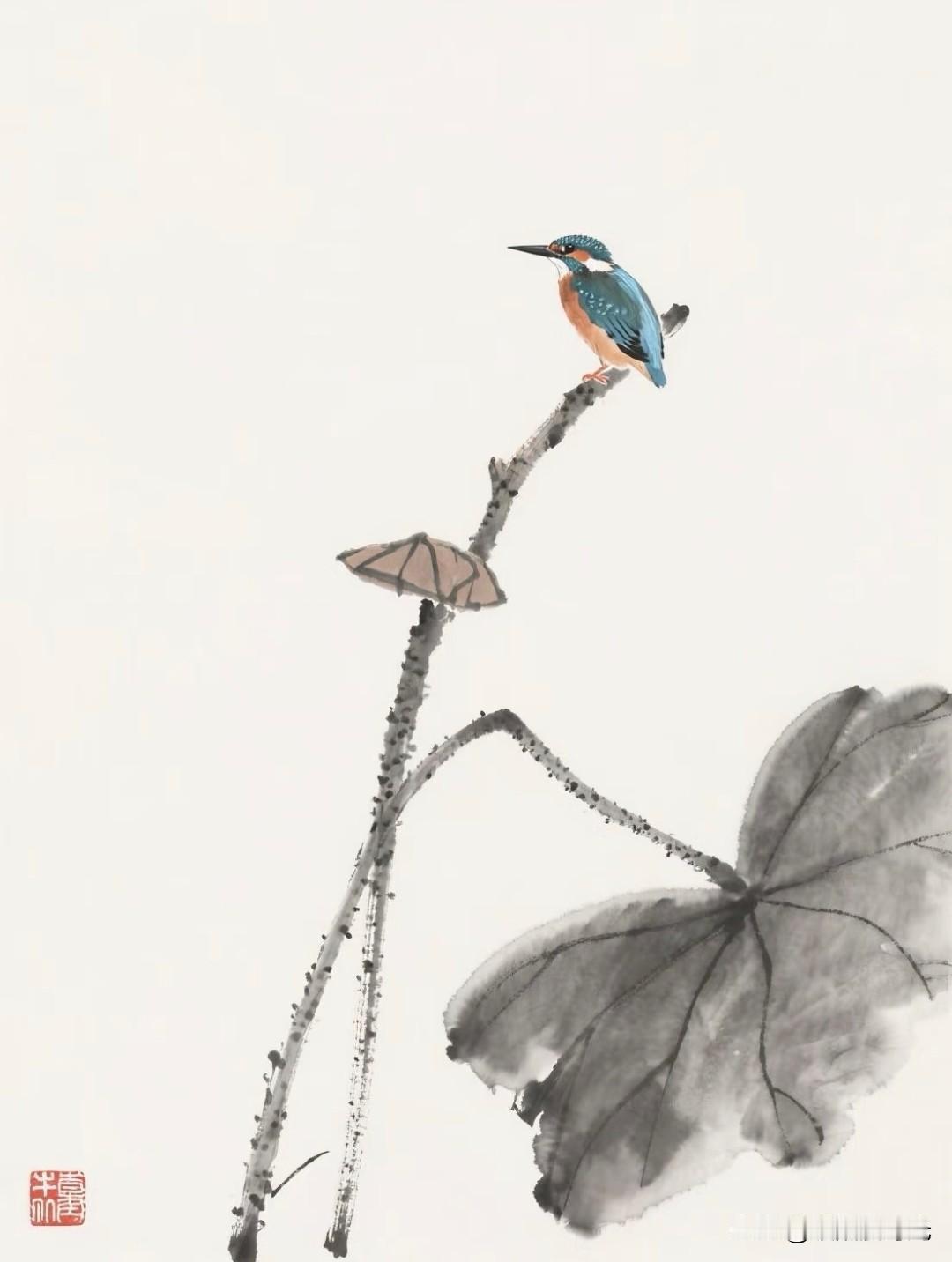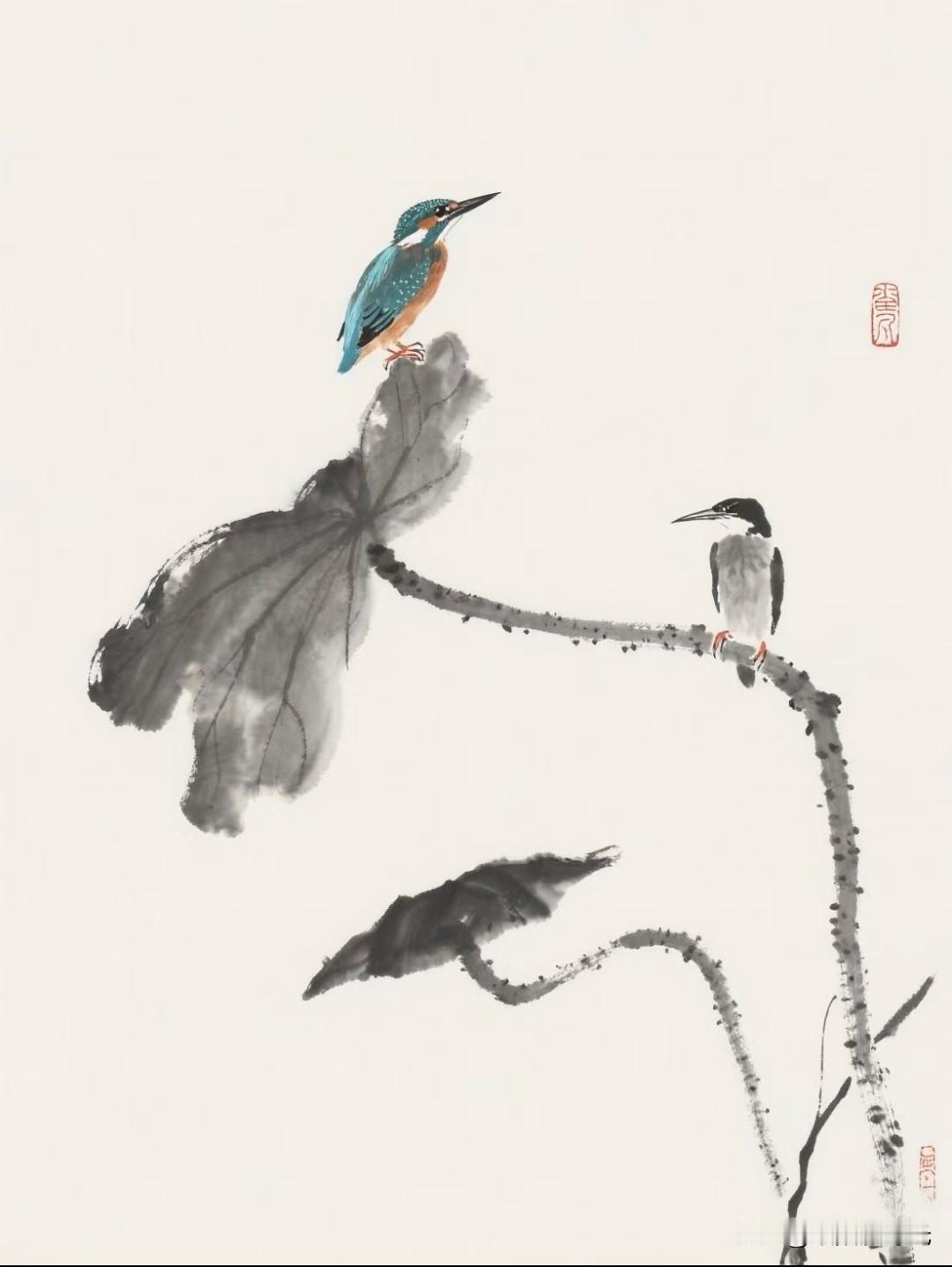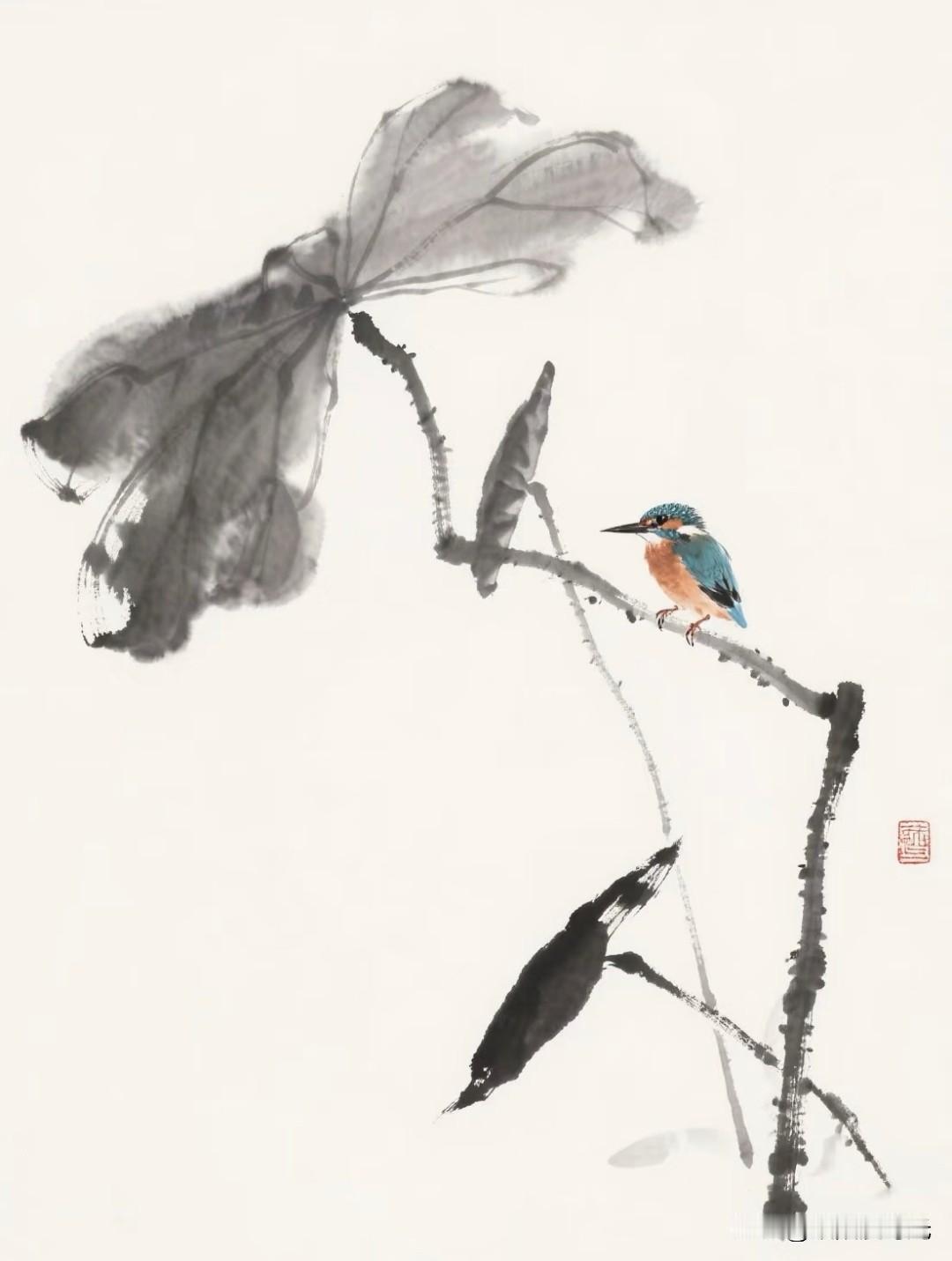 墨韵点羽,灵动静立枝头,生机盎然。 李迷糊翠鸟图分享 荷池翠鸟 翠鸟