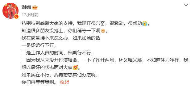 【谢娜回应演唱会秒罄】谢娜担心加场体力跟不上回应演唱会秒罄,很真诚啊!她说自己第