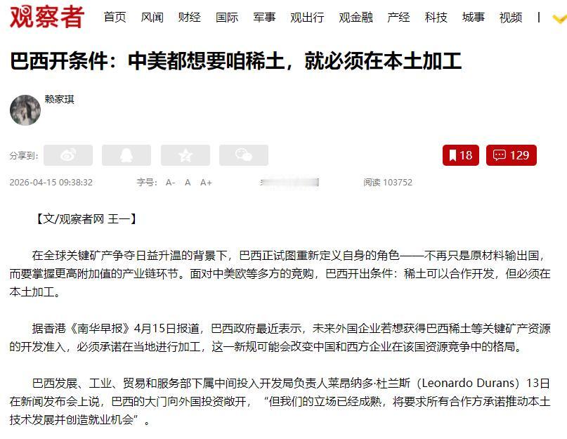 现在中美欧都缺稀土,新能源汽车、手机、军工都离不了,以前大家都靠中国,现在中国管得严了,巴西就成了香饽饽,各国都求着合作,巴西自然有底气提条件。