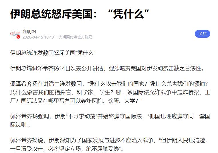 伊朗总统佩泽希齐扬14号公开讲话的时候,当着全世界的面,把美国一顿臭骂,连珠炮似的问了6个问题,他直接冲美国喊:凭什么打我们国家?凭什么杀我们的领袖?凭什么杀我们的指挥官、科学家、学生?哪条规矩允许打仗炸桥梁、工厂?又哪条规矩允许炸医院、诊所、大学?