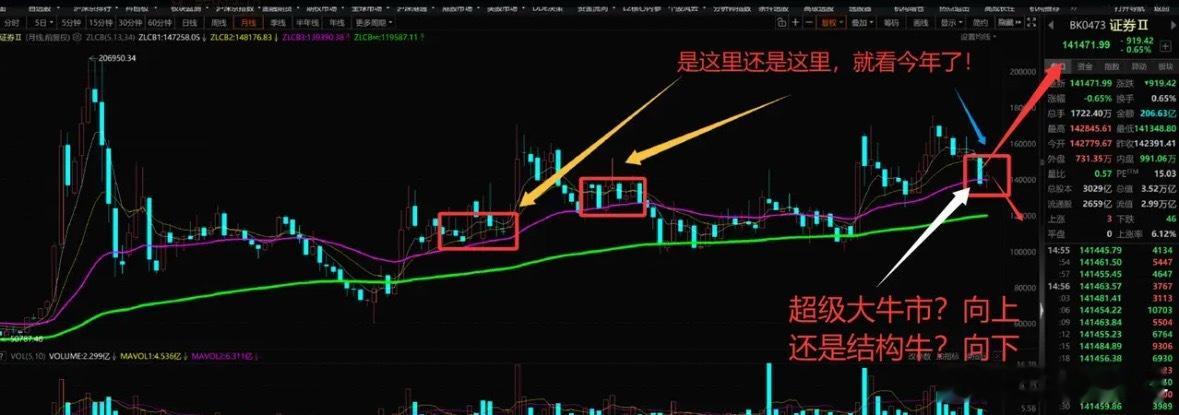 假设,这是一轮超级大牛市!当前市场的成交量稳定在2万亿左右,而超级大牛市后面可以达到3万,4万亿,甚至5万亿?对券商的业绩和股价影响有多大?3 万亿日均成交头部券商普遍涨幅:+75%~+100%4 万亿日均成交头部券商普遍涨幅:+140%~+180%5 万亿全面牛市头部券商普遍涨幅:+200%~+290%如果,这不是一轮超级大牛市!!!而是结构牛行情,那么,2万~3万亿左右的成交量就是天花板!!!券商上限也就毫无空间可言!所以,问题就是在,你们觉得这里是结构行情,还是超级大牛市的中前期?