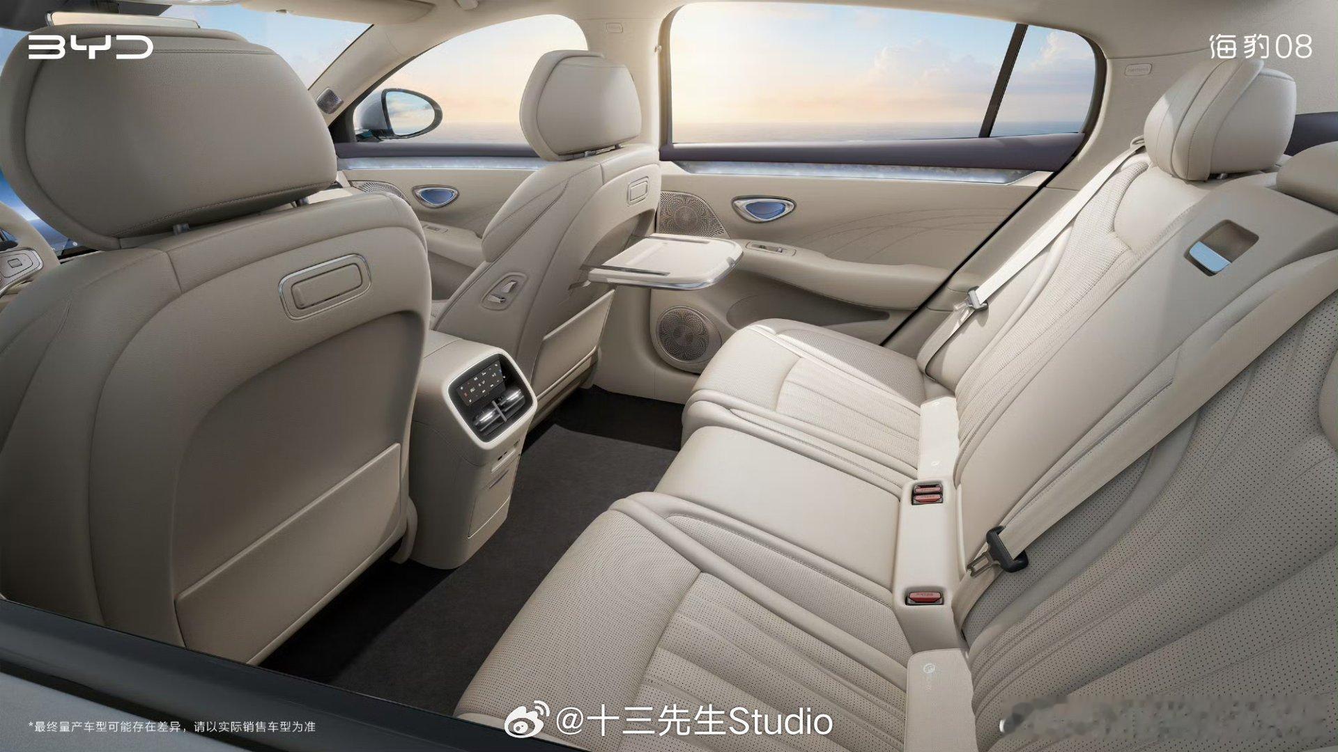 内饰的后排明显增加了舒适属性,加长的左右坐垫,厚C柱隐私遮挡,小桌板和pad拓展接口让后排乘坐体验进一步增强~海洋旗舰轿车海豹08大v聊车 吉利银河星耀7全球预售发布