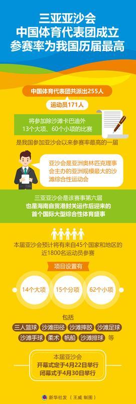 三亚亚沙会 中国体育代表团成立动员会15日在北京召开。中国体育代表团共派出255人,其中运动员171人,将参加除沙滩卡巴迪外13个大项、60个小项的比赛,是我国参加亚沙会以来参赛率最高的一届。本届亚沙会开幕式定于4月22日举行,闭幕式于4月30日举行,地点均在三亚市天涯海角游览区亚沙公园。